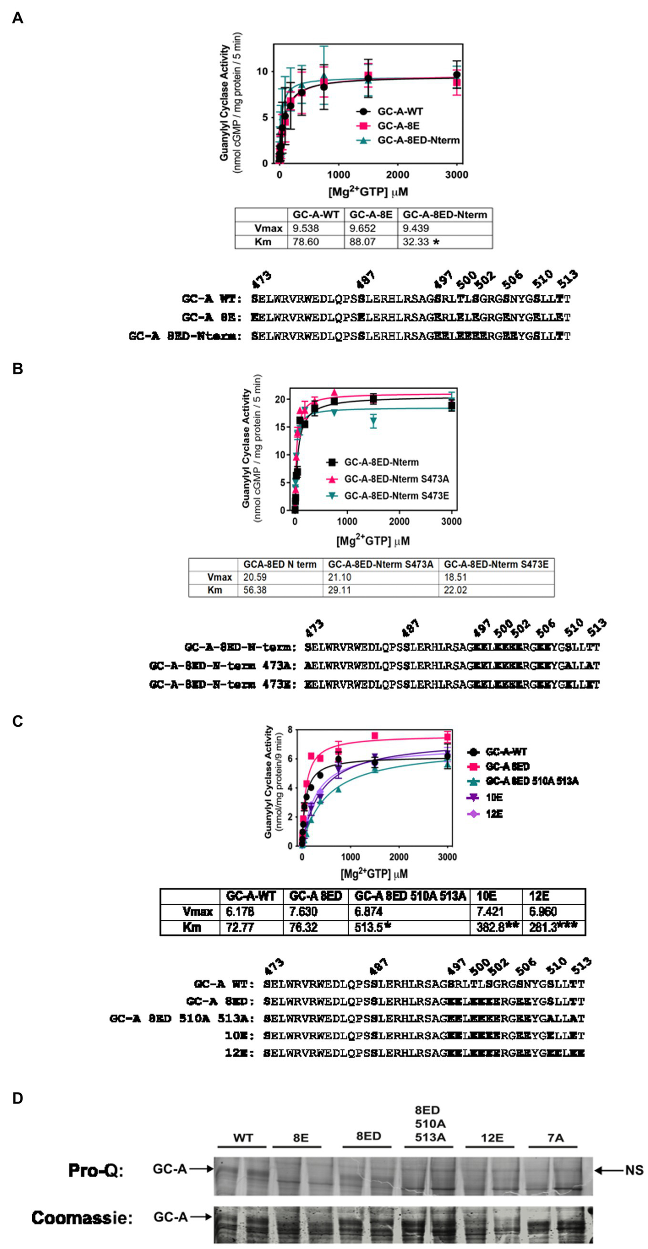 Figure 2. Vicinal Glu substitutions at Ser497, Thr-500, Ser-502 and Ser-506 produce a WT-like version of GC-A. 293T cells were transiently transfected with the indicated version of GC-A and membranes from these cells were assayed for GC activity for 5 min in the presence of 1 uM ANP, 1 mM ATP, and increasing concentrations of GTP. The amino acid sequences of the individual constructs used in each experiment are shown below each panel. (A) Comparison between GC-A-WT, GC-A-8E, and GC-A-8ED-N term where n = 4 from two experiments. * indicates that the Km of GC-A-8ED-Nterm is significantly lower than the Kms from the other two constructs. (B) Comparison between GC-A-8ED-Nterm, GC-A-8ED-Nterm-473E, GC-A-8ED-Nterm-473A, where n = 3 from three transfections. (C) Comparison between, GC-A-WT, GC-A-8ED-Nterm, GC-A-8ED-Nterm-510A and 513A, GC-A-10E, and GC-A-12E where n = 3 from three transfections. * indicates that the Km of GC-A-Nterm-510A and 513A is significantly different from those of both GC-A-WT and GC-A-8ED-Nterm. ** indicates that the Km of GC-A-10E is significantly different from the Km of GC-A-Nterm-510A and 513A. *** indicates that the Km of 12E is significantly different from GC-A-10E. All differences are at p < 0.05 significance. (D) The indicated receptor constructs were transfected into 293T cells, then immunoprecipitated, fractionated by SDS-PAGE and stained with ProQ Diamond (top panel) to determine receptor phosphate content followed by Coomassie staining (bottom panel) to measure receptor protein levels. The arrows indicate the location of phosphorylated GC-A. NS next to the right-side arrow means non-specific band.