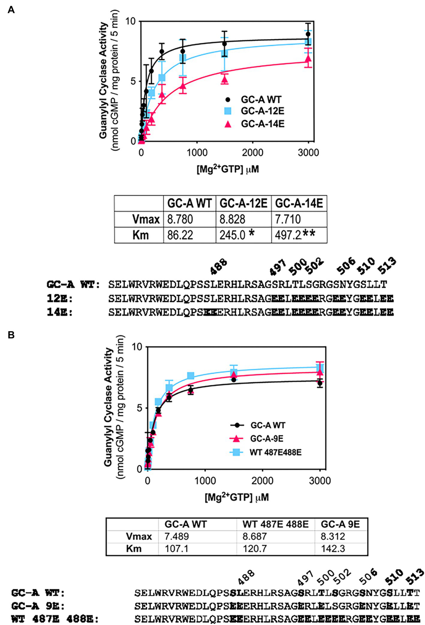 The initial report describing the Ser-487 phosphorylation site in GC-A, suggested that phosphorylation at this residue is inhibitory (Schroter et al., 2010). However, our efforts to create a dephosphorylated mutant of GC-A that has WT-like activity required the conversion of Ser-487 to Glu in GC-A-7E to make the single Glu-substitution mutant GC-A-8E (Otto et al., 2017), which is consistent with this site increasing activity. To determine whether the Ser-487 increases or decreased activity, we tested whether Glu substitutions at both Ser-487 and Leu-488 would increase or decrease the activity of various forms of GC-A. First, we examined whether converting Ser-487 and Leu-488 in GC-A-12E to make GC-A-14E would affect the Km of the enzyme and found that the Km of GC-A-14E was higher than that of both WT-GC-A and GC-A-12E, which is consistent with this site inhibiting activity (Figure 4A). We also examined what effect substituting a Glu for Leu-488 in GC-A-8E to make GC-A-9E has on activity. Note that this construct has vicinal Glu substitutions at Ser-487 and Leu-488 but single Glu substitutions for the other seven chemically identified sites for a total of nine glutamates. Additionally, we converted Ser-487 and Leu-488 to Glu in WT-GC-A. We found that adding the vicinal Glu substitutions at Ser-487 and Leu-488 tended to increase the Km of GC-A regardless of whether the negative charge was from natural phosphorylation sites or from single Glu substitutions, although none of these differences were statistically significant (Figure 4B). Hence, our best interpretation of the data from the vicinal substitutions, like the single substitution, suggests that the Ser-487 site inhibits GC activity as originally reported by Schroter et al. (2010).