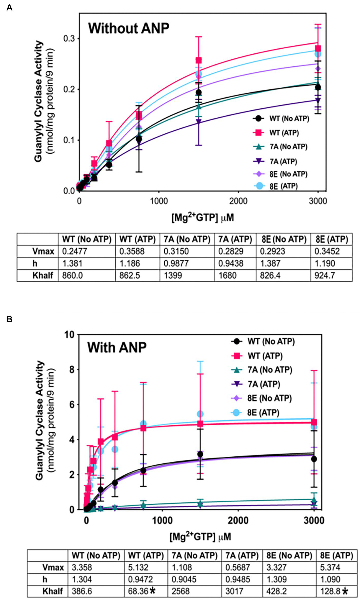 NPs decrease the Km of GC-A and GC-B by a process involving ATP binding to a pseudosymmetric allosteric site in the catalytic domains (Antos and Potter, 2007; Robinson and Potter, 2012) and possibly the kinase homology domains (Joubert et al., 2005; Burczynska et al., 2007; Edmund et al., 2019) of these enzymes. To determine whether phosphorylation is required for allosteric activation of GC-A, we compared the ability of ATP to reduce the Km of phosphorylated WT-GC-A, the original phosphomimetic mutant GC-A-8E (S473E, S487E, S497E, T500E, S502E, S506E, S510E, T513E) as initially described (Otto et al., 2017), and the dephosphorylated mutant, GC-A-7A (S487A, S497A, T500A, S502A, S506A, S510A, and T513A) in the presence (Figure 5B) and absence (Figure 5A) of ANP. Please note that the Km is represented by “K half” in Figure 5. With ANP, ATP reduced the Hill slope and Km of phosphorylated WT-GC-A and GC-A-8E but had no effect on GC-A-7A, consistent with phosphorylation being required for allosteric regulation of GC-A. In the absence of ANP, ATP allosterically shifted product formation from positive cooperative to linear for both WT-GC-A and GC-8E as evidenced by reductions in the Hill slope of the enzymes (Figure 5A). However, the Hill slope for GC-A-7A was approximately 1 and it did not change regardless of whether ATP was included in the reaction. These data indicate that phosphorylation, solely due to its ability to increase local negative charge, is required for allosteric regulation of GC-A.