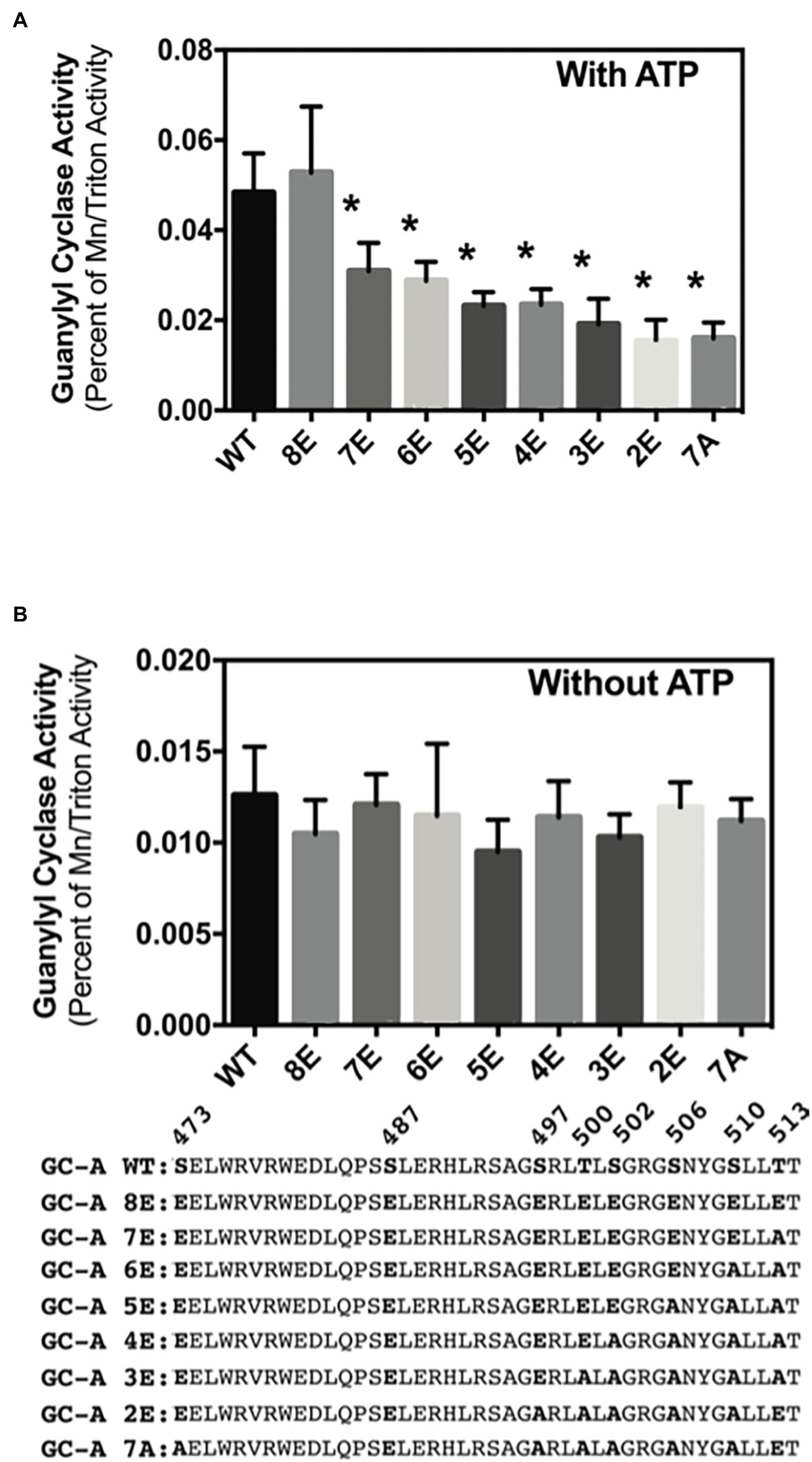 Single glutamate substitutions at all six chemically identified phosphorylation sites in GC-A yielded an enzyme called GC-A-6E that had a Km 11-fold higher than the phosphorylated WT enzyme. A possible explanation for the inability of single Glu substitutions to completely mimic the effects of phosphorylation sites is that they only have a negative charge of −1, whereas phosphoserines and phosphothreonines can have a negative charge as high as negative as −2 in cells. As originally employed by Strickfaden et al. (2007) who were studying the effect of phosphorylation of Ste5 on cell cycle regulation in yeast, we used vicinal Glu mutations to mimic the −2 charge of a phosphoserine or a phosphothreonine. Vicinal Glu mutations at all six originally identified sites produced an enzyme called GC-A-12E with a Km only 2.8 higher than the WT enzyme, which is a large improvement over the activity observed for GC-A-6E with single Glu substitutions. However, the Km of GC-A-12E was still slightly higher than the Km of the phosphorylated WT enzyme. Only GC-A-8ED-Nterm, with vicinal Glu mutations for the first four N terminal phosphorylation sites and phosphates on the two remaining residues produced a Km lower than that of the phosphorylated WT enzyme. In GC-A-8ED-Nterm, Ser-510 and Ser-513 are phosphorylated, yet vicinal Glu mutations at these same residues to produce GC-A-12E does not produce an enzyme with WT activity. Why GC-A-12E had slightly less activity than the WT enzyme may be explained by the negative charge on each Glu being in different orientations since they are on different carbons, which would not be the case with the natural phospho-amino acids since the negative charges from the hydroxyl groups are on the same phosphate. It is also not known if having double negative charges at each phosphorylation site is the optimal configuration for GC activity or whether the double glutamate substitutions produce other unforeseen conformations.