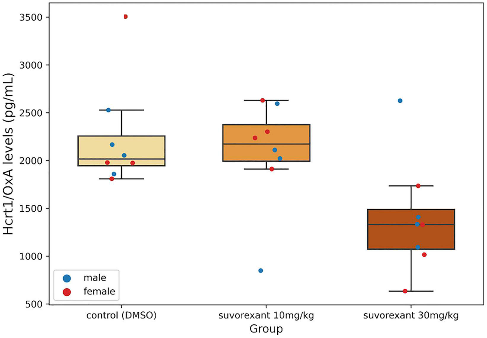 Cerebrospinal fluid (CSF) Hcrt1/OxA levels. Boxplots show the values for the CSF Hcrt1/OxA concentration in the different experimental groups. Each dot represents a single Hcrt1/OxA measure in CSF for the four males and the four females in each group. The three horizontal lines of the boxes represent the first, second (median), and third quartiles, respectively, with the whisk extending to 1.5 inter-quartile range.