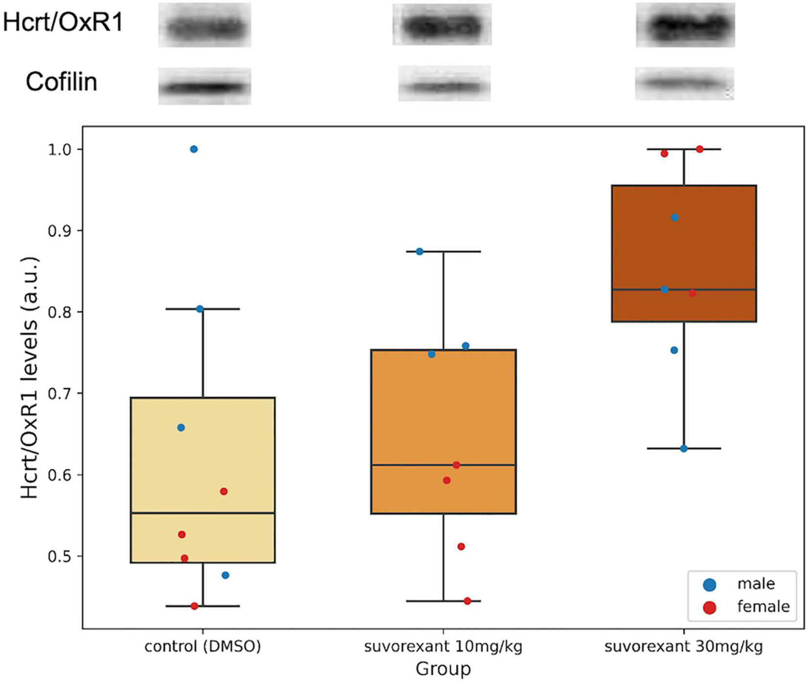 Hcrt/OxR1 hypothalamic levels. Western blots for Hcrt/OxR1 and cofilin in hypothalamic extracts from each experimental group. Boxplots show the relative hypothalamic values of Hcrt/OxR1 levels normalized to cofilin for each group. Dots represent single measures of Hcrt/OxR1 levels normalized to cofilin for the males and the females in each group. The number of subjects for the Hcrt/OxR1 analysis in the experimental groups is seven due to the lack of tissue availability in one subject. The three horizontal lines of the boxes represent the first, second (median), and third quartiles, respectively, with the whisk extending to 1.5 inter-quartile range.