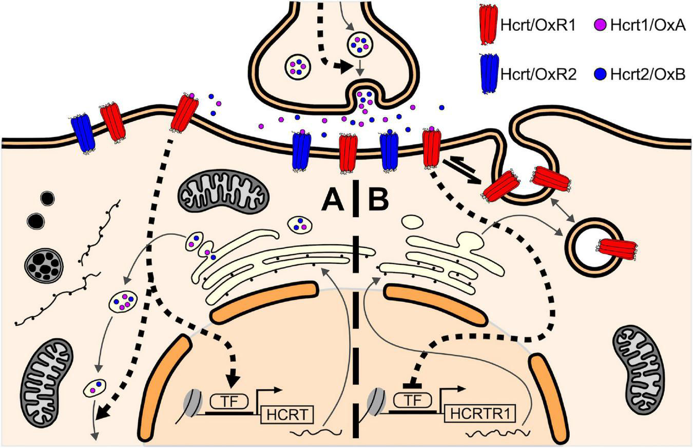 Self-regulatory model of the Hcrt/Ox system mediated by Hcrt/OxR1 within the hypothalamic Hcrt/Ox neurons. (A) Hcrt1/OxA binding to Hcrt/OxR1 in the Hcrt/Ox neurons would activate downstream signaling pathways that induce the expression of the HCRT gene and/or Hcrt/Ox peptides release (dashed arrows), thus establishing a positive feedback loop for Hcrt/Ox peptide synthesis/release. (B) On the other hand, Hcrt1/OxA binding to Hcrt/OxR1 would also activate signaling cascades that block the expression of the HCRTR1 gene (blunted-head dashed arrow) and/or induce the internalization of available Hcrt/OxR1 on the plasma membrane to intracellular vesicles (equilibrium arrow), thus establishing a negative feedback loop for the availability of Hcrt/OxR1. This self-regulating function of the receptor, which could also be present in other neuronal groups, would counteract the positive feedback loop for Hcrt/Ox peptide synthesis, generating a homeostatic balance between them. TF, transcription factor.