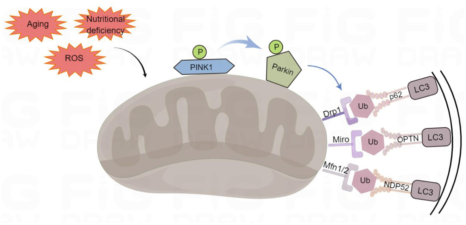 Ubiquitin-dependent mitophagy. PTEN-induced putative kinase 1 (PINK1) recognizes the damaged mitochondria, recruits Parkin to the damaged mitochondrial outer membrane, and phosphorylates it. Parkin can ubiquitinate proteins on the outer mitochondrial membrane, such as Mfn1/2 (mitofusins 1 and 2), Drp1 (dynamin-related protein 1), and Miro (mitochondrial Rho) to form polyubiquitin chains, which act as an “eat-me” signal for the autophagy mechanism to signal p62/SQSTM1 (sequestosome 1), optineurin (OPTN), and NDP52 (nuclear dot protein 52 kDa). They initiate mitophagy by LC3 (binding to light Chain 3) on autophagosomes through their LIR (LC3-interacting region) domains. By Figdraw (www.figdraw.com).