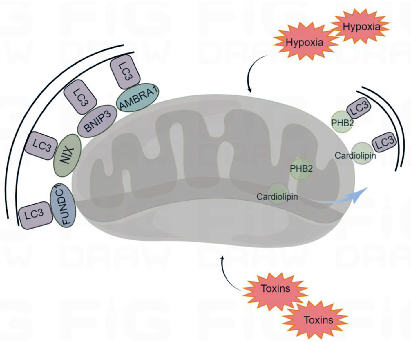 Receptor-mediated mitophagy. Under certain conditions (hypoxia and toxins) mitophagy receptors are activated. The mitophagy receptors containing LIR (LC3-interacting region) motifs, such as FUNDC1 (FUN14 Domain Containing 1), BNIP3 (BCL2 Interacting Protein 3), NIX (Nip3-like protein X), AMBRA1 (Activating Molecule in Beclin1-regulated Autophagy), PHB2 (Prohibitin 2), and cardiolipin, interact with the autophagosome light chain 3 (LC3), targeting the damaged mitochondria for mitophagy. By Figdraw (www.figdraw.com).