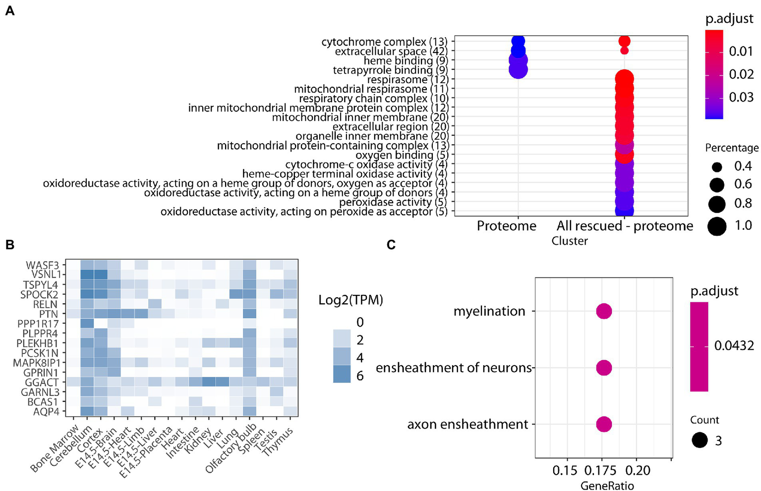 (A) Enrichment analysis for biological processes, molecular function, and cell components of proteins altered in the cerebellum of TG mice. The color-gradient indicates the adjusted p-value for the enrichment. Numbers in parentheses indicate the number of identified proteins in each category. Dot size corresponds to “protein count for each group”/“total protein count for each category.” (B) Heatmap showing the expression across tissues (TPM, transcript per million) of the cerebellar proteins found to be differentially abundant in our study, showing their cerebellar enrichment. (C) Enrichment analysis on the cerebellar-enriched proteins using the GO annotations.