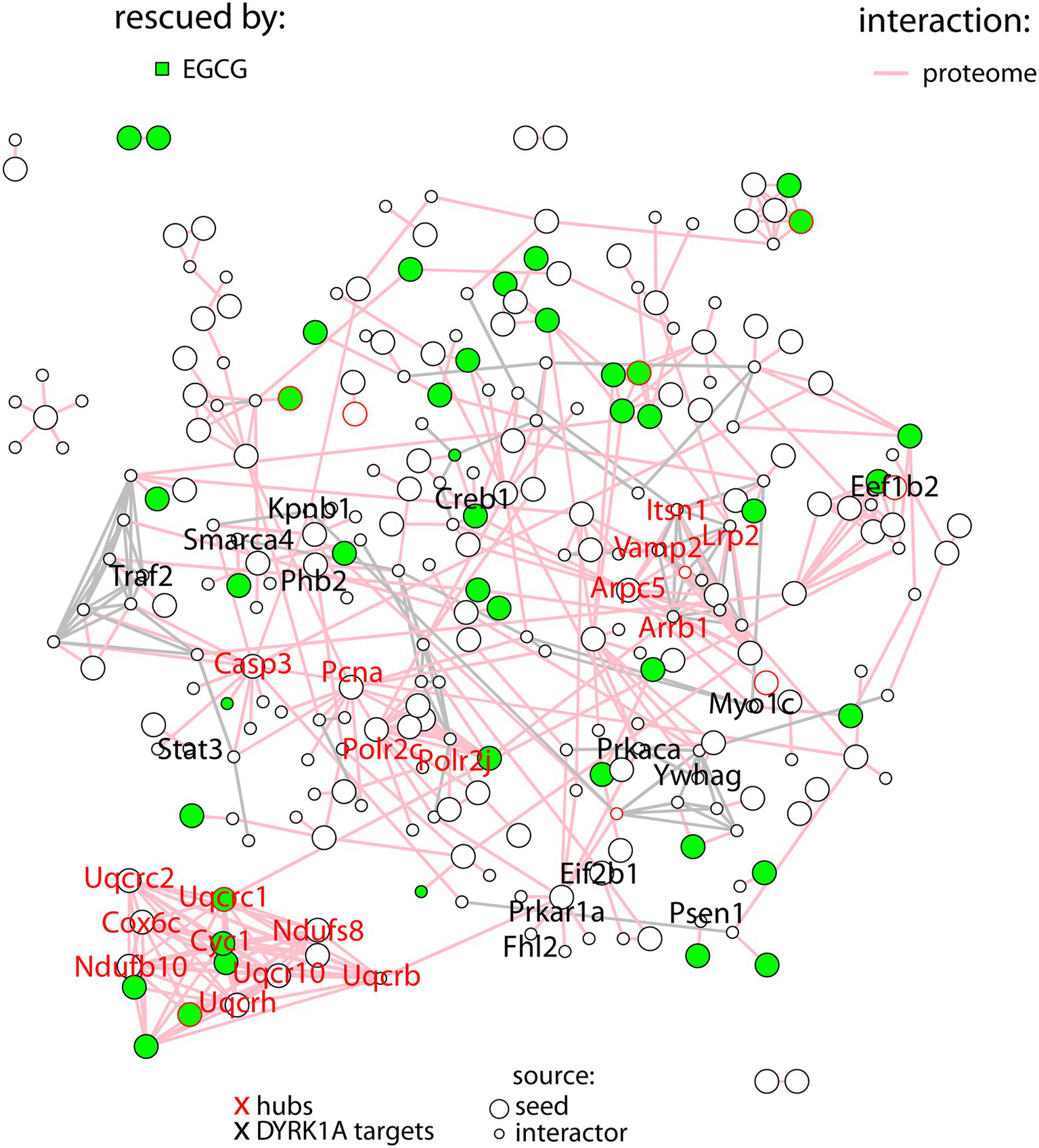 Protein–protein interaction network with the proteins differentially abundant in TG mice (seed proteins), represented as big nodes and their primary interactors (small nodes). Interactions between two seed proteins are depicted as pink edges. Interactions between interactors are shown in gray. Proteins rescued upon treatment are colored in green. The names of the hubs are depicted in red, the names of DYRK1A targets in black.