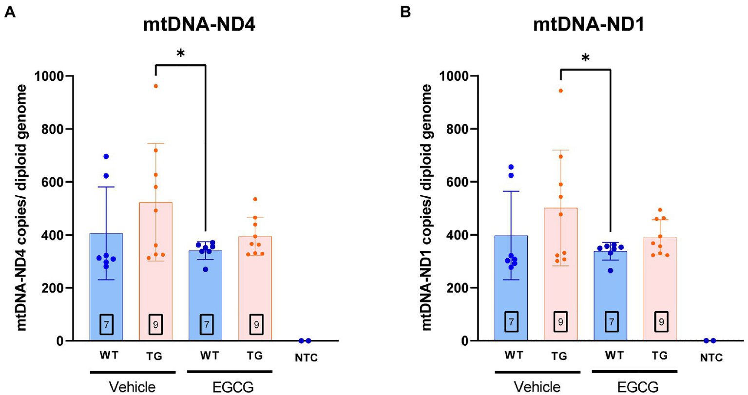 Our results showed that Dyrk1A overexpression alters oxidative phosphorylation and mitochondrial function in the cerebellum of transgenic mice. These alterations are significantly rescued upon EGCG-containing green tea extract treatment, suggesting that its effects in DS could depend in part on targeting mitochondria, as shown by the partially restoration by the treatment of the increased mtDNA copy number in TG non-treated mice.