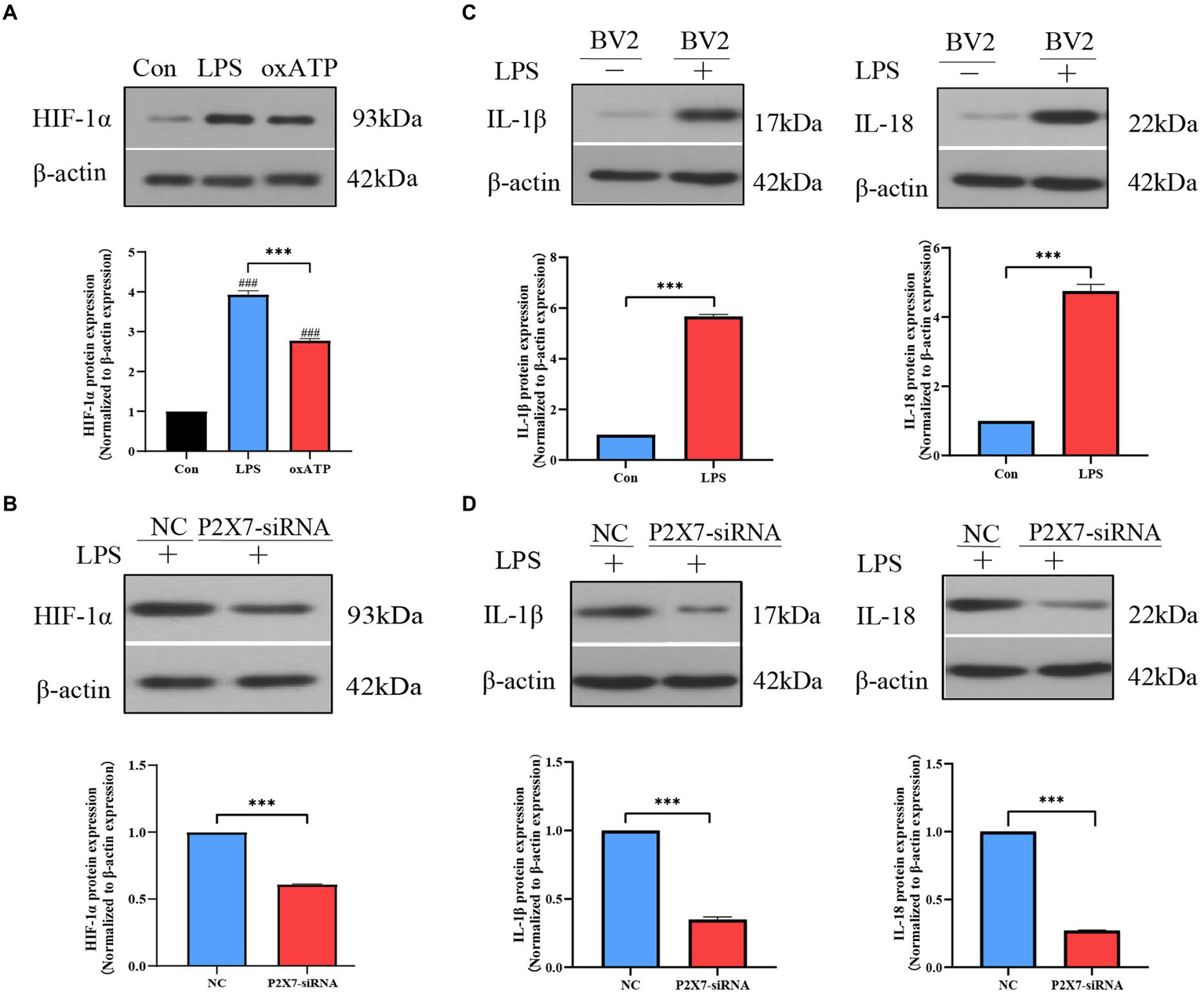 Effects of P2X7 on HIF-1α expression and inflammatory factors levels in BV2 cells. (A) Western blot results showed that LPS-induced upregulation of HIF-1α expression which was inhibited by oxATP. ###p < 0.001 vs. control, ***p < 0.001 vs. LPS group. (B) HIF-1α expression was downregulated with P2X7 siRNA pretreatment. ***p < 0.001 vs. negative control group. (C) LPS induced upregulation of IL-1β and IL-18. ***p < 0.001 vs. control. (D) The protein expression levels of IL-1β and IL-18 in BV2 cells treated with siRNA against P2X7. ***p < 0.001 vs. negative control group.