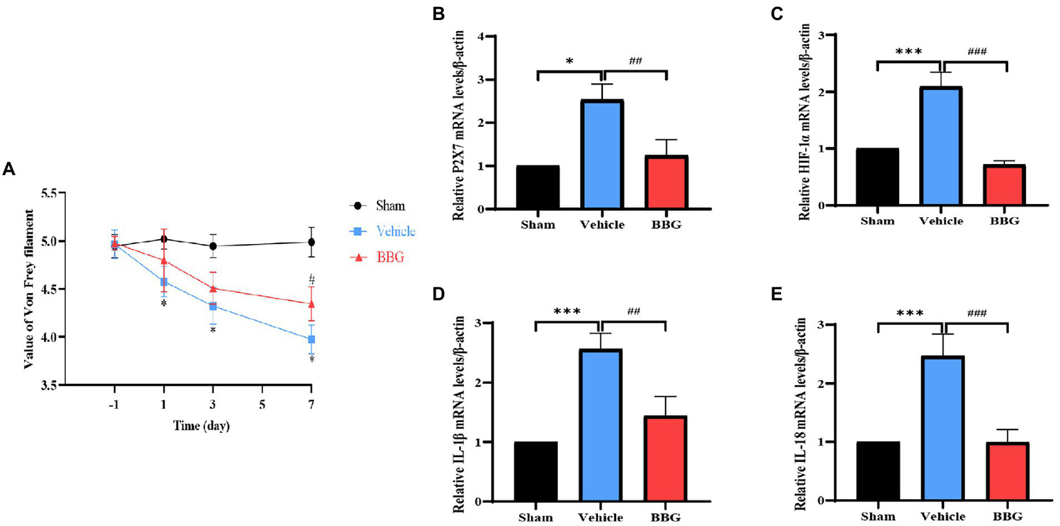 Effects of Brilliant Blue G (BBG) on pain behaviors and the expression of P2X7, HIF-1α, and inflammatory factors. (A) The pain threshold of the sham, vehicle and BBG rats. *p < 0.05 vs. sham, #p < 0.05 vs. vehicle. (B) The effect of dental pulp exposure and BBG treatment on mRNA level of P2X7 in MDH. *p < 0.05 vs. sham, ##p < 0.01 vs. vehicle. (C) The effect of dental pulp exposure and BBG treatment on mRNA level of HIF-1α in MDH. ***p < 0.001 vs. sham, ###p < 0.01 vs. vehicle. (D) The effect of dental pulp exposure and BBG treatment on mRNA level of IL-1β in MDH. ***p < 0.01 vs. sham, ##p < 0.01 vs. vehicle. (E) The effect of dental pulp exposure and BBG treatment on mRNA level of IL-18 in MDH. ***p < 0.001 vs. sham, ###p < 0.01 vs. vehicle.