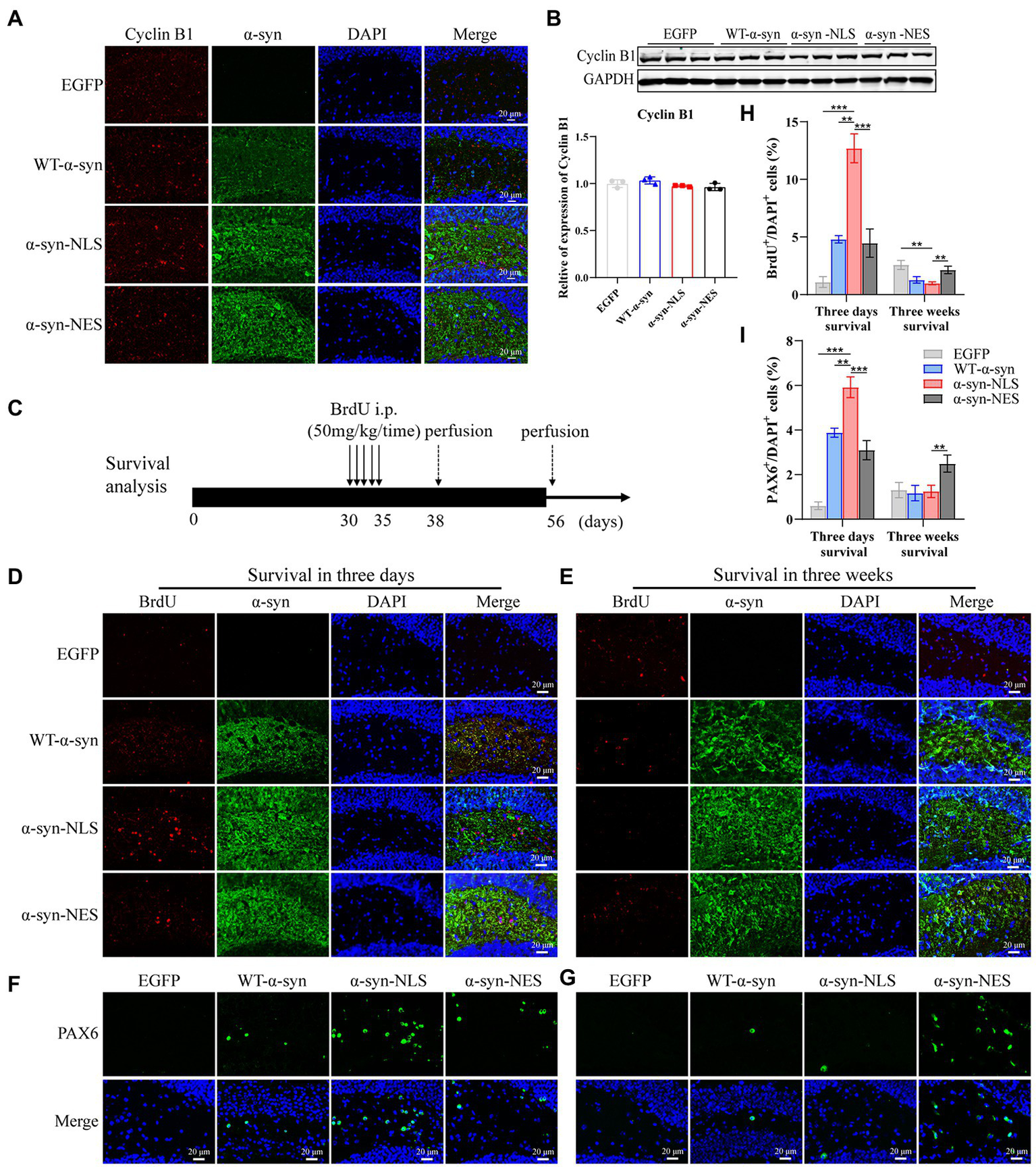 Cell cycle progression is blocked before G2 phase and cells exit the cell cycle. (A) The expression of cell cycle G2 phase protein Cyclin B1 was detected by immunofluorescence. (B) Western blot and relative level analysis of Cyclin B1 protein after 1 month of virus injection (n = 3). (C) A pattern diagram for detecting neuronal cell survival. BrdU was injected once a day starting from month 1 after virus injection for five consecutive days. BrdU-positive cells were examined on day 3 (survival 3-days) and day 21 (survival 3-weeks) after last BrdU injection. (D) Representative BrdU-positive cells on day 3. (E) Representative BrdU-positive cells on day 21. (F) Representative PAX6-positive cells on day 3. (G) Representative PAX6-positive cells on day 21. (H) BrdU+ cells were quantified of three-days survival and three-weeks survival (n = 4). (I) PAX6+ cells were quantified of three-days survival and three-weeks survival (n = 4). **p < 0.01, ***p < 0.001.