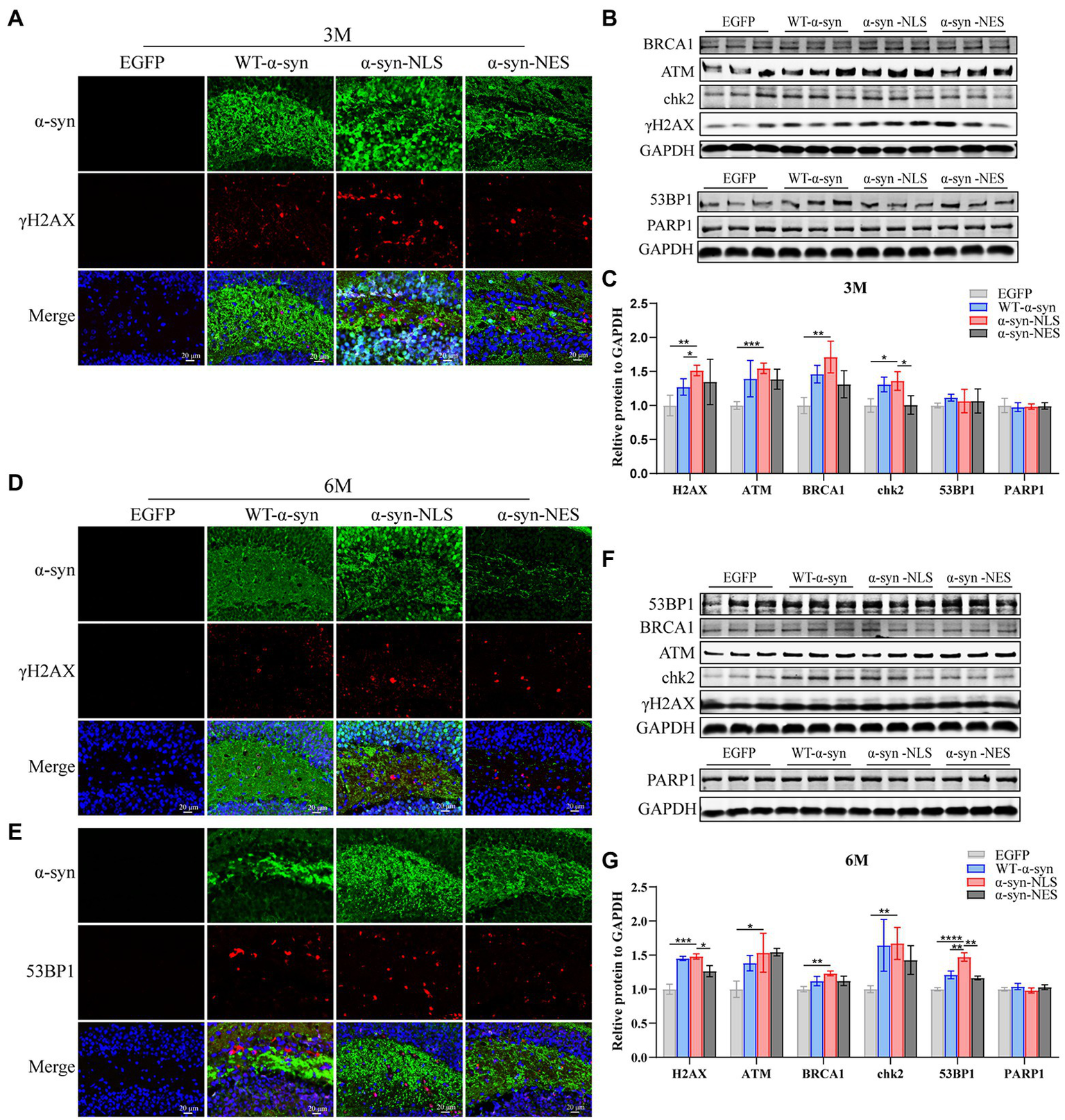 DNA damage caused by nuclear localized α-syn aggravates over time. (A,D) Immunofluorescence staining of mouse hippocampus with α-syn (green) and γH2AX (red) antibodies at months 3 and 6 after virus injection; DAPI was used to stain all nuclei (blue). (B,F) Western blot of the hippocampus tissues of mice with antibodies to γH2AX, ATM, BRCA1, chk2, 53BP1, and PARP1 (n = 3). (C,G) Relative levels of proteins (ratio to GAPDH) in western blot are presented (n = 3). (E) Immunofluorescence staining of mouse hippocampus with α-syn (green) and 53BP1 (red) antibodies at month 6 after virus injection; DAPI was used to stain all nuclei (blue). *p < 0.05, **p < 0.01, ***p < 0.001, ****p < 0.0001.
