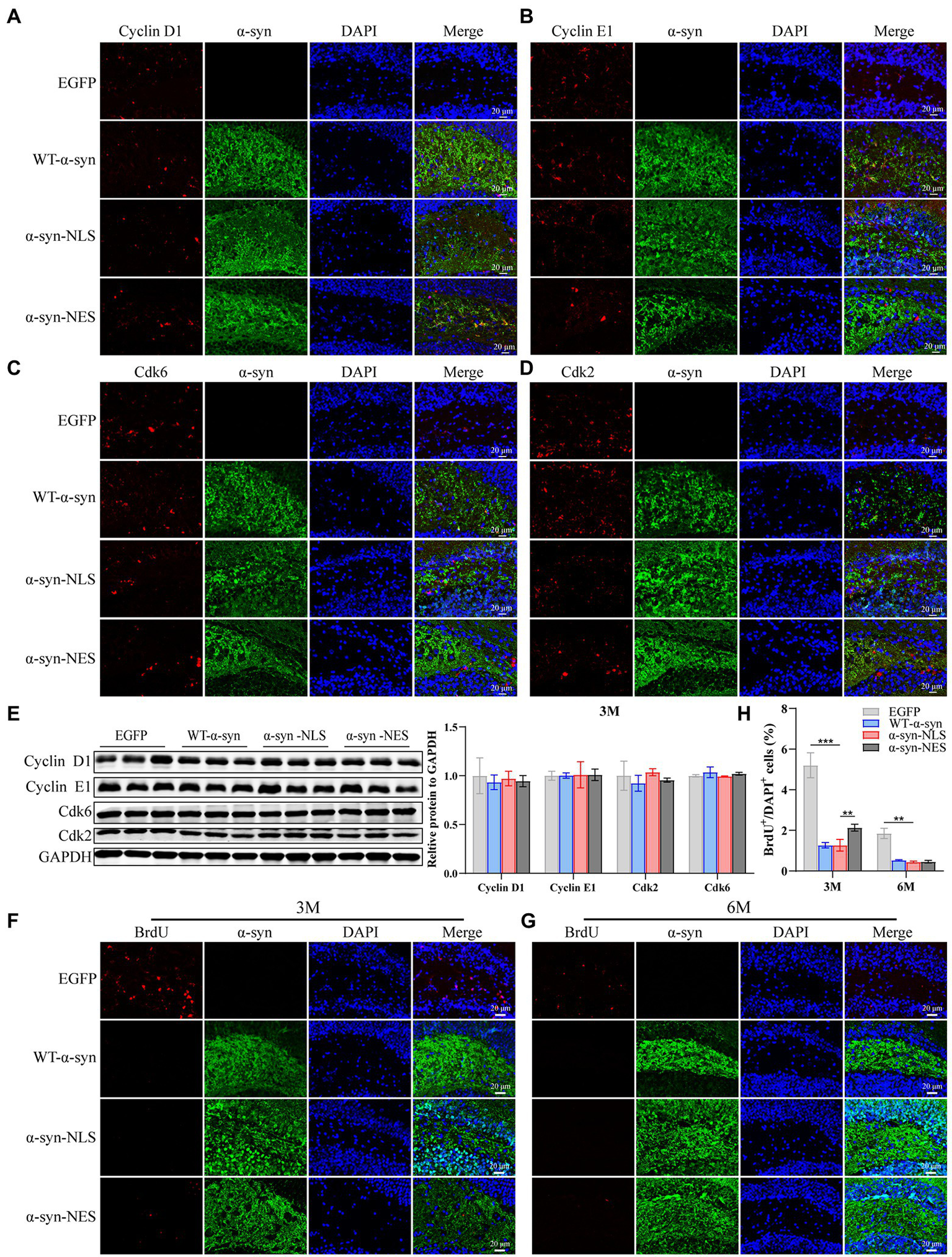 Long-term overexpression of α-syn inhibits neural cell proliferation. (A–D) The expression of cell cycle S phase proteins CDK2, CDK6, Cyclin D1, and Cyclin E1 was detected by immunofluorescence at month 3 after virus injection. (E) Western blot with CDK2, CDK6, Cyclin D1, and Cyclin E1 antibodies at month 3 after virus injection and their relative levels (n = 3). (F) Representative BrdU-positive cells staining image at month 3 after virus injection. (G) Representative BrdU-positive cells staining image at month 6 after virus injection. (H) BrdU+ cells were quantified at months 3 and 6 after virus injection (n = 4). **p < 0.01, ***p < 0.001.