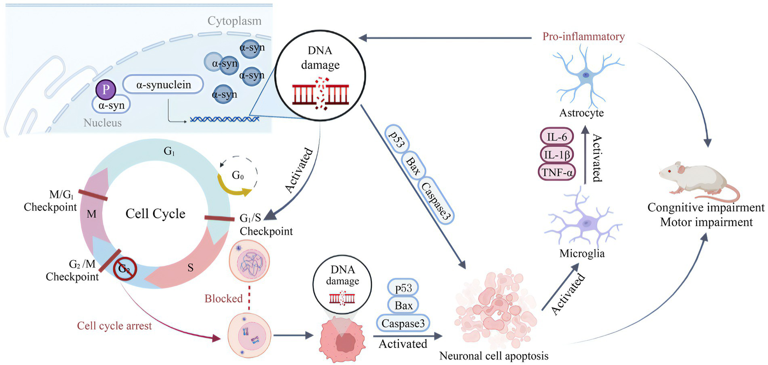 Schematic diagram for summarizing the behavioral impairment in mice caused by overexpression of α-syn in hippocampal neuron nuclei. The nuclear overexpression of α-syn causes DNA damage in hippocampal neurons, and leads to cell cycle activation and abnormal blockade, further induced hippocampal neuronal apoptosis and inflammatory response. Then the inflammation further aggravates DNA damage, creating a vicious cycle that ultimately promotes cognitive impairment and motor impairment in mice. The schematic illustration was drawn according to BioRender (https://biorender.com/).