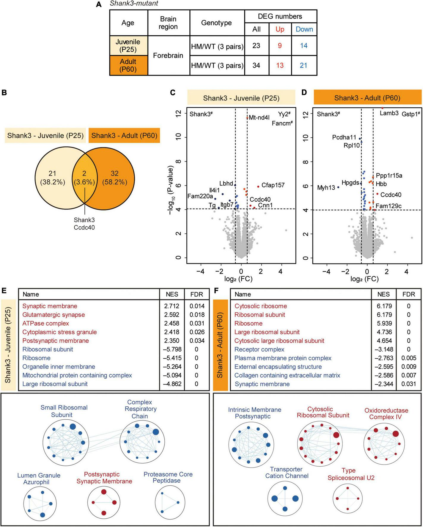 These findings indicate that Shank3 mice show age-dependent and nearly opposite transcriptomic patterns at juvenile and adult stages: Synaptic and ribosomal/mitochondrial genes are up- and downregulated, respectively, at P25, whereas opposite changes are observed at P60.