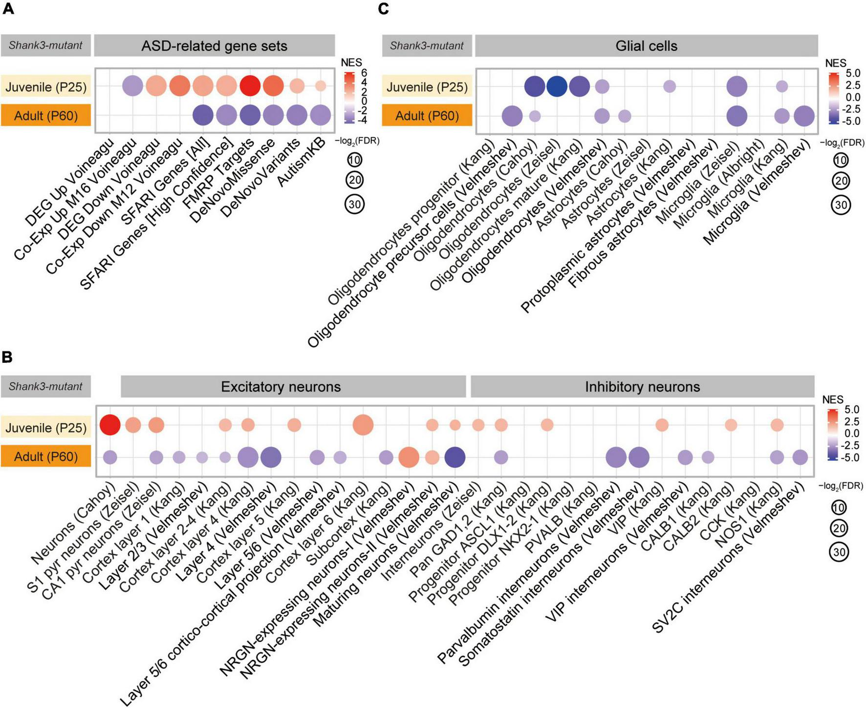 Supplementary Figure 3Autism spectrum disorder (ASD)-related patterns in P25-Shank3 and P60-Shank3 transcripts. (A–C) The GSEA results in Figure 2 are shown here again with the insignificantly enriched gene sets indicated by square dots, together with the significant enrichments indicated by circular dots, to show that the insignificant enrichments have generally smaller NES scores compared with those of significant enrichments.