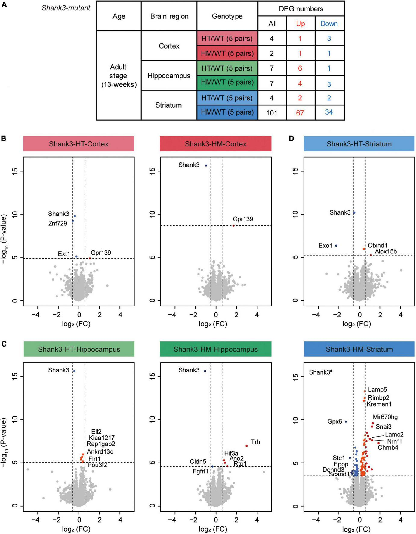 Differentially expressed gene (DEG) analysis of transcripts from the cortex, hippocampus, and striatum of Shank3-HT and Shank3-HM mice. (A) Outline of the DEGs from the cortex, hippocampus, and striatum of adult Shank3-heterozygous (HT) and Shank3-homozygous (HM) mutant mice, compared with WT mice. DEGs were defined by transcriptional changes with adjusted p value < 0.05 (n = 5 mice for cortex/hippocampus/striatum regions in WT, Shank3-HT, and Shank3-HM mice). (B–D) Volcano plots showing DEGs from the cortex, hippocampus, and striatum of adult Shank3-heterozygous (HT) and Shank3-homozygous (HM) mutant mice. The DEGs (adjusted p value < 0.05) were further color-coded to indicate those with stronger fold changes (>1.5). Shank3# in the Shank3-HM volcano plot indicates a p value beyond the indicated p-value ranges (n = 5 mice for cortex/hippocampus/striatum regions in WT, Shank3-HT, and Shank3-HM mice).