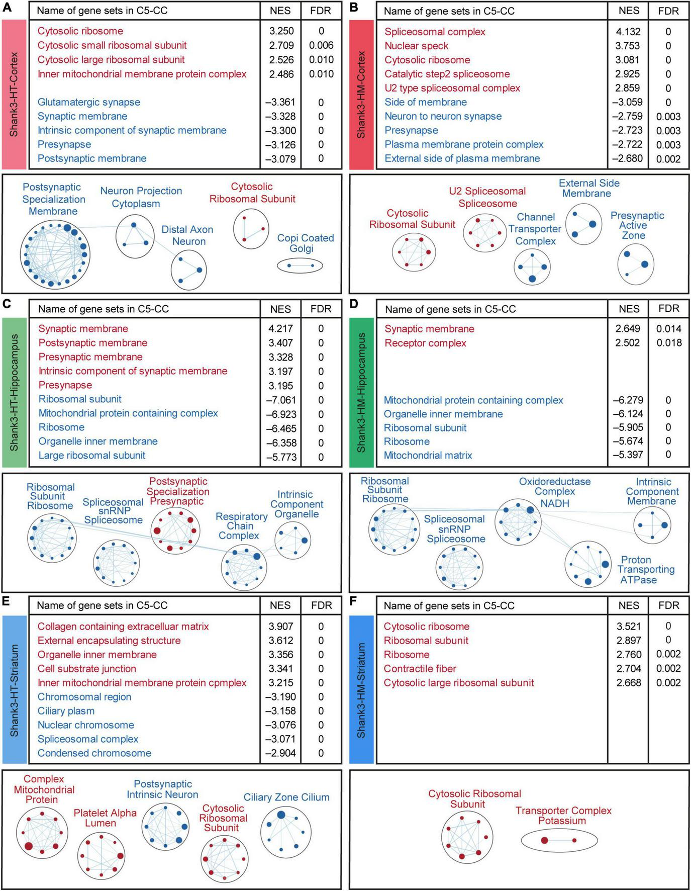Gene set enrichment analysis (GSEA) of transcripts from the cortex, hippocampus, and striatum of Shank3-HT and Shank3-HM mice. (A–F) GSEA results obtained for cortical, hippocampal, and striatal Shank3-HT and Shank3-HM transcripts using the gene sets in the cellular component (CC) domain, as represented by the list of top-five positively/negatively enriched gene sets (top; see Supplementary Table 7 for full results) and functional clustering of enriched gene sets performed using the EnrichmentMap Cytoscape App (bottom). The sizes and colors of the circles in the EnrichmentMap results indicate the extents and directions (positive/negative; red/blue) of the enrichments, respectively (n = 5 mice for cortex/hippocampus/striatum regions in WT, Shank3-HT, and Shank3-HM mice).