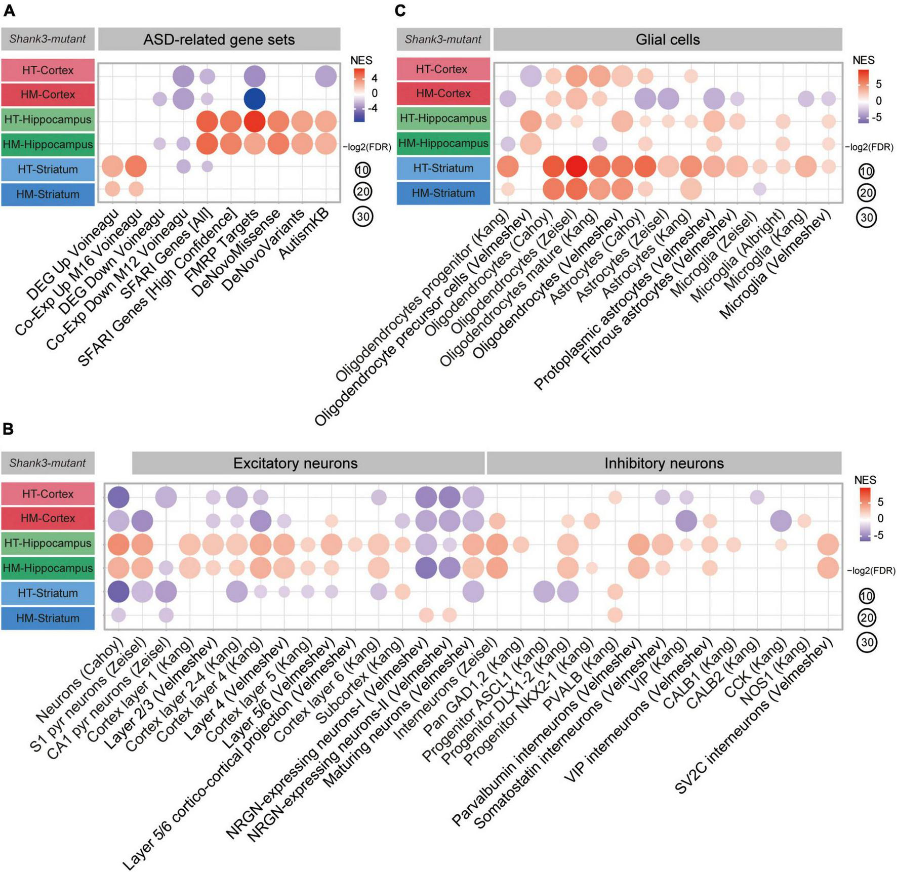 Autism spectrum disorder (ASD)-related patterns in the transcripts from the cortex, hippocampus, and striatum of Shank3-HT and Shank3-HM mice. (A) Gene set enrichment analysis (GSEA) results for the cortical, hippocampal, and striatal Shank3-HT and Shank3-HM transcripts: Enrichment patterns for ASD-related gene sets that are upregulated (DEG Up Voineagu and Co-Exp Up M16 Voineagu) or downregulated (DEG Down Voineagu and Co-Exp Down M12 Voineagu) in ASD, as well as for ASD-risk gene sets (SRARI Genes [All], SFARI Genes [High Confidence], FMRP Targets, DeNovoMissense, DeNovoVariants, and AutismKB) (n = 5 mice for cortex/hippocampus/striatum regions in WT, Shank3-HT, and Shank3-HM mice). (B) GSEA results for the cortical, hippocampal, and striatal Shank3-HT and Shank3-HM transcripts, indicating enrichment patterns for cell type-specific gene sets (glutamate and GABA neurons) (n = 5 mice for cortex/hippocampus/striatum regions in WT, Shank3-HT, and Shank3-HM mice). (C) GSEA results for the cortical, hippocampal, and striatal Shank3-HT and Shank3-HM transcripts, indicating enrichment patterns for cell type-specific gene sets (glial cells) (n = 5 mice for cortex/hippocampus/striatum regions in WT, Shank3-HT, and Shank3-HM mice).