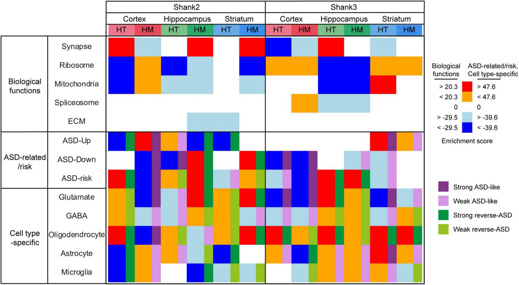 Regarding dissimilarities, we find that: (1) Shank2-HT/HM and Shank3-HT/HM transcripts show different gene dosage effects, in that Shank2-HT and Shank2-HM transcripts show largely opposite patterns with regard to altered biological functions and ASD-related/risk gene expressions, whereas Shank3-HT and Shank3-HM transcripts are largely similar in these aspects. (2) Stronger similarities across Shank2 and Shank3 mice are observed in HM conditions mice, whereas stronger dissimilarities are observed in HT conditions; i.e., Shank2-HM and Shank3-HM cortical transcripts show similar ASD-like patterns, and Shank2-HM and Shank3-HM hippocampal transcripts show similar reverse-ASD patterns, whereas Shank2-HT and Shank3-HT cortical transcripts, or Shank2-HT and Shank3-HT hippocampal transcripts, show opposite ASD-like patterns. (3) Opposite ASD-like patterns are observed in the striatal regions of Shank2-HT and Shank3-HT mice (reverse-ASD and ASD-like, respectively), similar to cortical and hippocampal regions, although the difference becomes less clear in Shank2/3-HM striatal transcripts, unlike cortical and hippocampal regions in which Shank2/3-HM transcripts become similar.