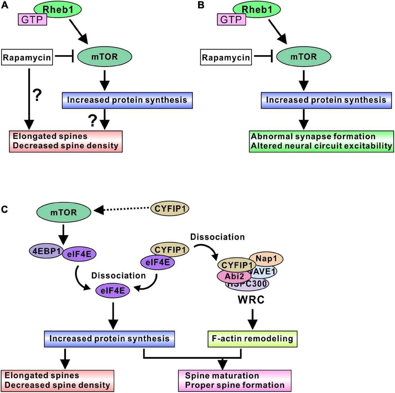 mTORC1-mediated spine and synapse regulation in TSC models. (A) Active mTORC1 may elongate dendritic spines and decrease spine density, probably through the increased protein synthesis. In addition, rapamycin treatment could aggravate the spine dysmorphogenesis. (B) Active mTORC1 alters synapse function and neural circuit excitability. Inhibition of mTORC1 by rapamycin and its derivative normalizes abnormal neural excitability, indicating mTORC1-mediated protein synthesis is involved in adequate synapse formation and function. (C) Schematic model of protein synthesis and spine morphogenesis. Active mTORC1 dissociates eIF4E from 4EBP1, and dissociated eIF4E promotes protein synthesis. Dysregulation of protein synthesis may cause elongated spine formation. However, rapamycin experiments suggest that modulation of protein synthesis alone does not provide the correct control of spine morphogenesis. CYFIP1 is another binding partner of eIF4E. Dissociation of eIF4E from CYFIP1 also promotes protein synthesis. Furthermore, dissociated CYFIP1 is incorporated into WRC protein complex and regulates F-actin remodeling, suggesting that CYFIP1-mediated protein synthesis control is associated with the F-actin remodeling changes. Therefore, regulation of both protein synthesis and F-actin remodeling could be required for the normal spine formation and maturation. Because excess amount of CYFIP1 activate mTORC1 signaling, CYFIP1 may be another regulator of mTORC1 activity.