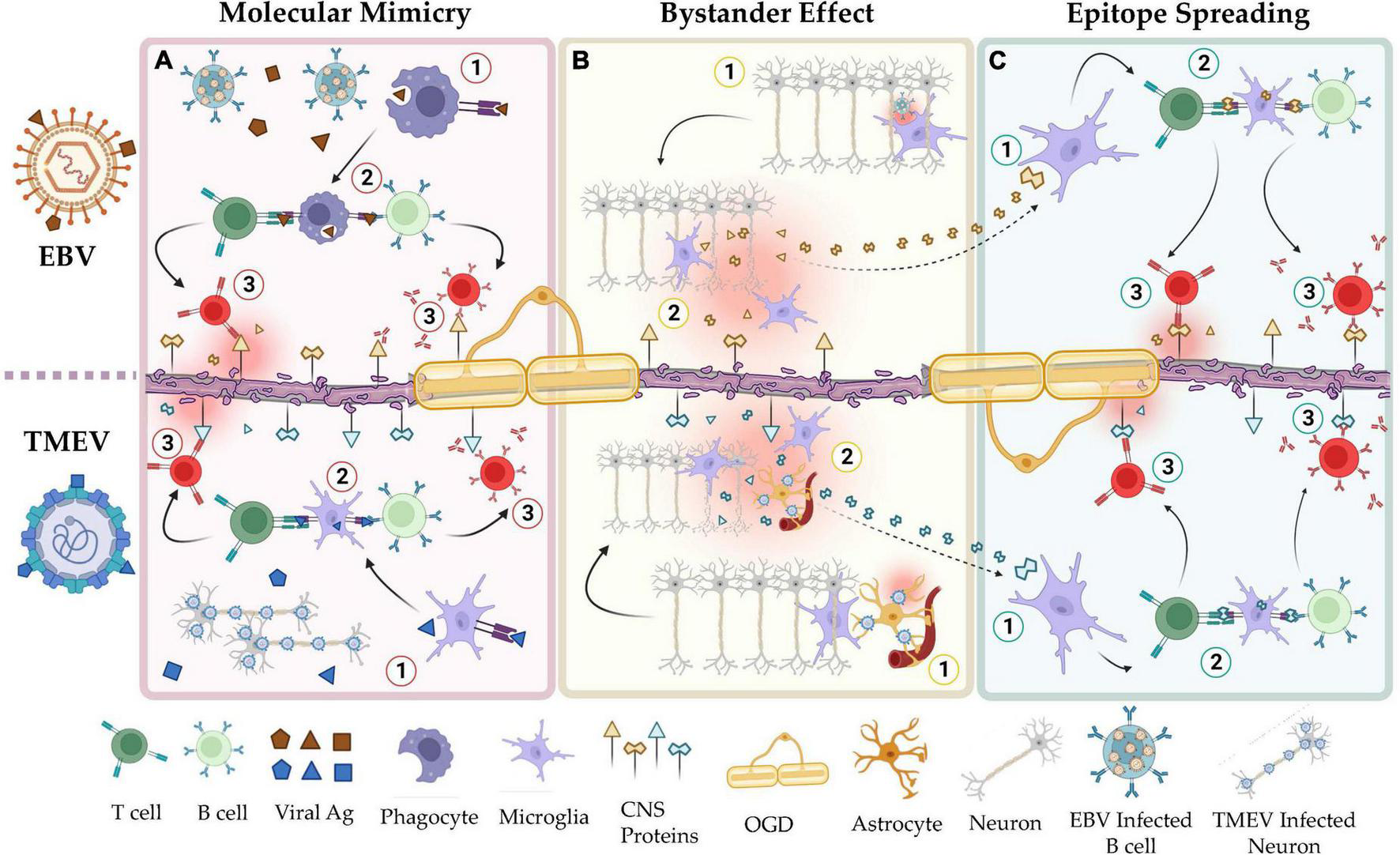 Shared mechanisms of autoimmunity in the viral hypotheses of MS and the TMEV-IDD model of MS. (A) Mechanisms of molecular mimicry in EBV (top) and TMEV infection (bottom). Viral peptides, e.g., EBNA-1, share structural homology with CNS resident self-peptides, e.g., GlialCAM. Natural immunization to these viruses induces autoimmunity toward the CNS resident proteins. (B) Mechanisms of bystander effect in EBV (top) and TMEV infection (bottom). Responses by resident immune cells to latent or reactivated virus in the CNS induces collateral damage to adjacent tissues. (C) Mechanisms of epitope spreading in EBV (top) and TMEV infection (bottom). Peptides released by apoptotic or damaged cells are used to activate self-reactive lymphocytes. In a positive feedback cycle, the autoimmune reaction by these cells releases additional cellular debris. As this cycle continues, the set of self-peptides that are recognized by auto-reactive lymphocytes increases via clonal expansion. This figure was illustrated using Biorender.com.