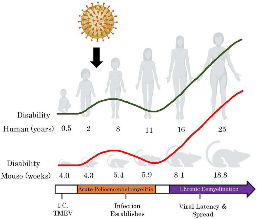 TMEV-IDD models how childhood exposures to common viruses may induce autoimmunity upon adulthood. By mapping the ages of mice in the TMEV-IDD model to human correlates (Wang et al., 2020), we observe that the acute phase of the TMEV infection occurs during childhood, and the chronic phase begins in early adulthood. Red line represents relative clinical disability accumulation in TMEV-IDD over time and the green line shows this with respect to human years. I.C, intracranial. This figure was illustrated using Biorender.com.
