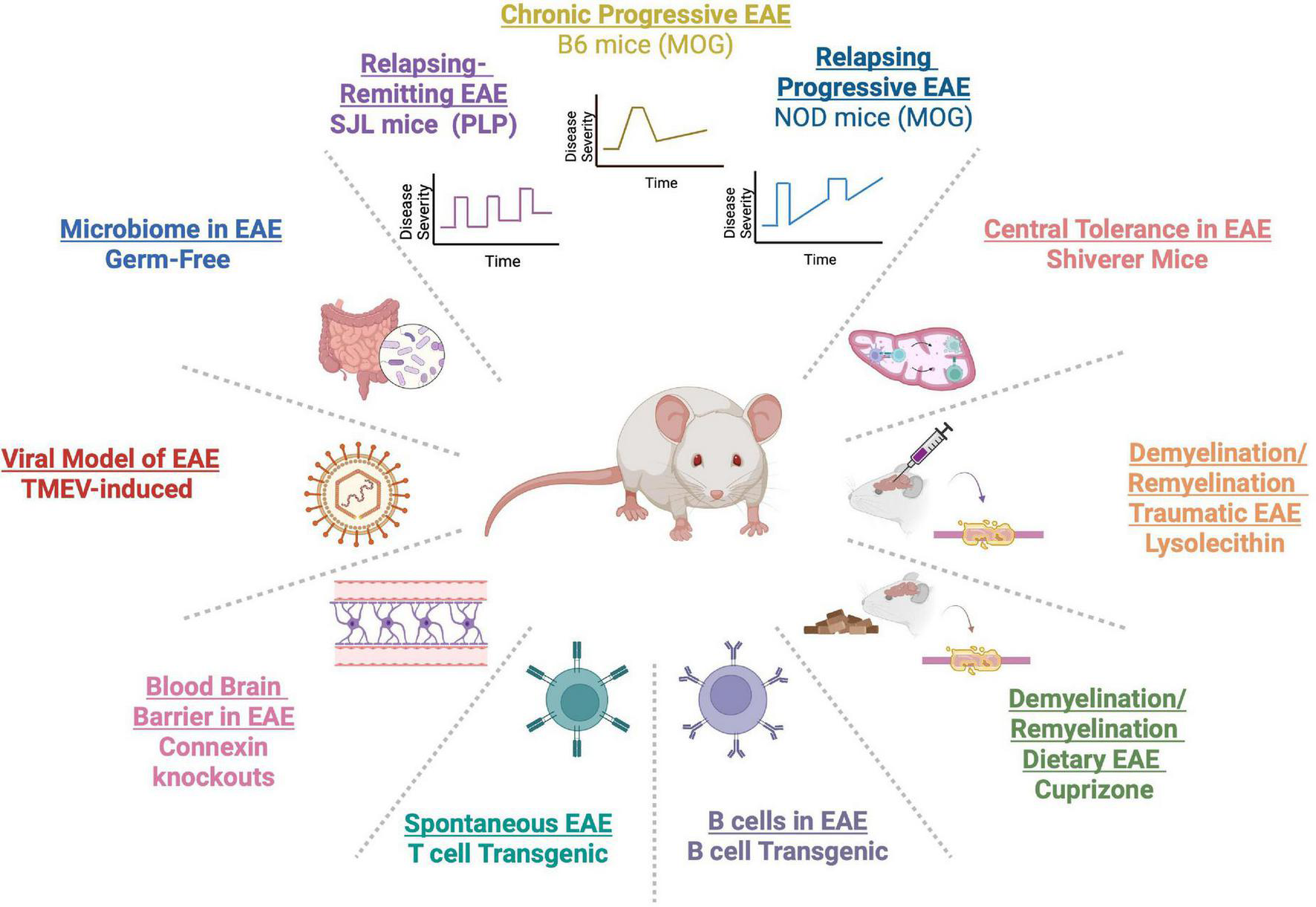 A myriad of experimental autoimmune encephalomyelitis (EAE) models have been developed to capture varied aspects of the clinical course of multiple sclerosis (MS) [C57BL/6 (B6), SJL/J, and PL/J mice]. Genetic models have allowed the study of T and B cells in MS in TCR and B-cell receptor (BCR) transgenics. Germ-free models have enabled the study of the gut microbiome. Viral models, such as Theiler’s murine encephalomyelitis virus (TMEV), have elucidated viral contribution to MS. MS-related demyelination and remyelination has been studied in cuprizone and lysolecithin models. Connexin knockouts have been used to study the role of the blood brain barrier (BBB) in neuroinflammation. Central tolerance has been examined in shiverer transgenic mice.
