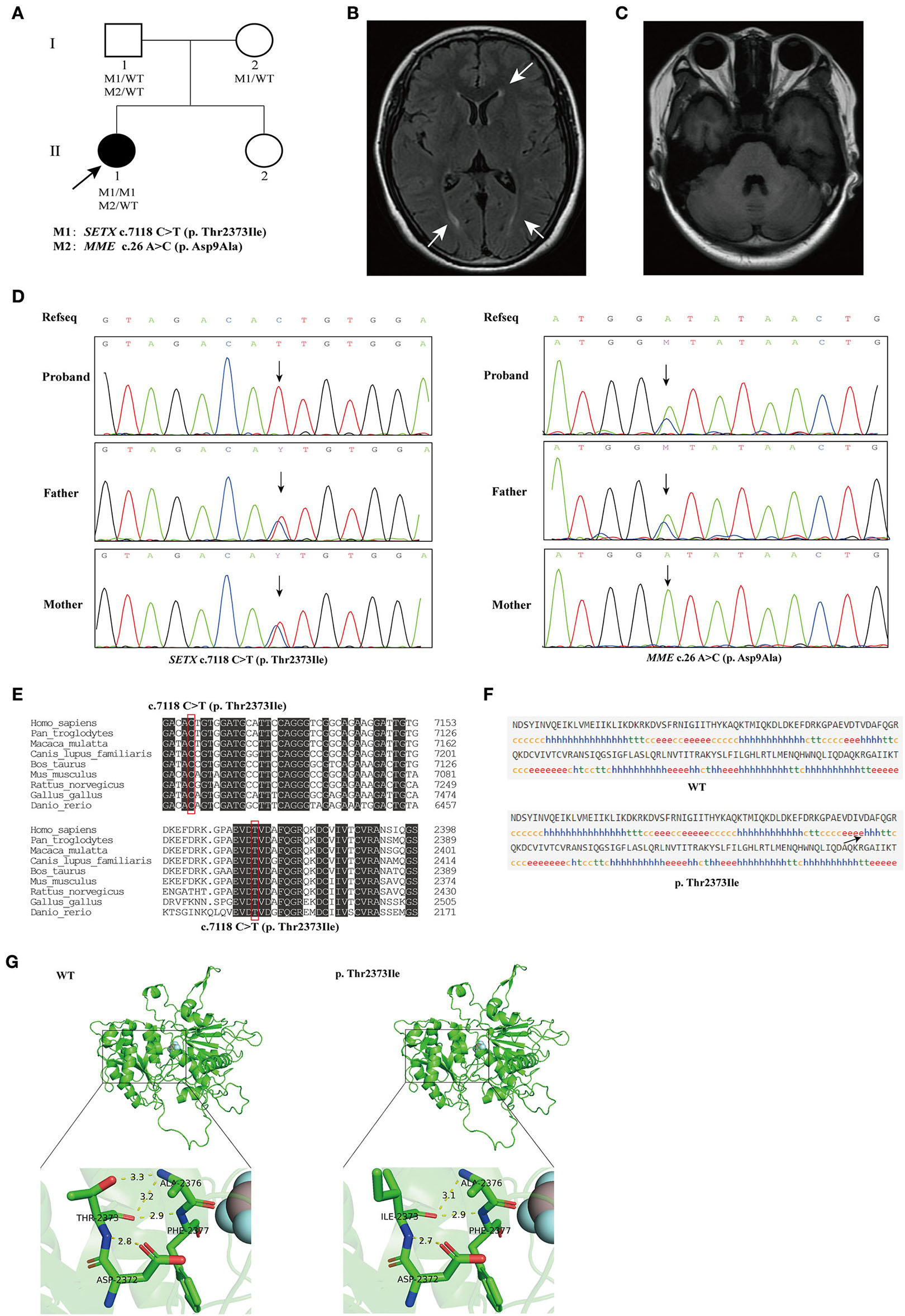 (A) The pedigree of the family. The black arrow indicates the proband that subjected for Whole-exome sequencing (WES). (B) Brain magnetic resonance imaging (MRI) of the proband, showing mild degeneration of white matter (white arrows). (C) Brain MRI of the proband, showing normal cerebellum. (D) Sequencing results showed that the homozygous variant c.7118C>T (p. Thr2373Ile) of SETX was inherited from both of the proband's parents (left), and the c.26A>C (p. Asp9Ala) variant in MME was inherited from the proband's father (right). (E) Conservation analysis of SETX c.7118C>T (p. Thr2373Ile) variant. (F) Secondary structures of wild-type and SETX p. Thr2373Ile variant were analyzed by SOPMA (Self-Optimized Prediction method with Alignment) online. h, α-helix; e, extended strand, arrow indicates change in secondary structure. (G) Prediction of the change in the three-dimensional (3D) structure of senataxin by SETX c.7118C>T (p. Thr2373Ile) variant.