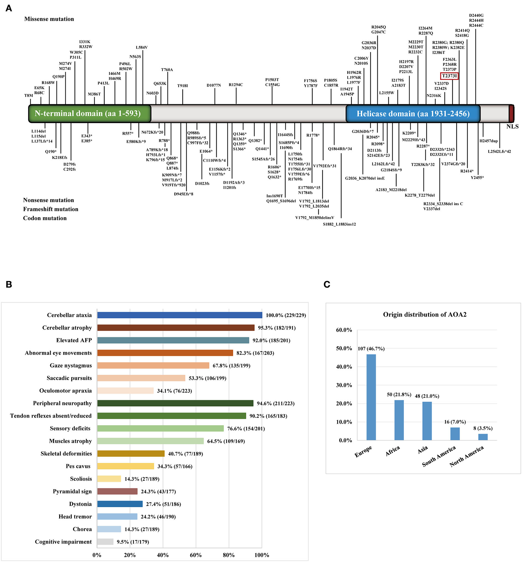 (A) Distribution of SETX gene variants in ataxia with oculomotor apraxia type 2 (AOA2) patients throughout exons. The variant in the red box was detected in the present study. (B) The clinical symptoms of AOA2 patients with SETX variants. (C) The origin distribution of the AOA2 patients.