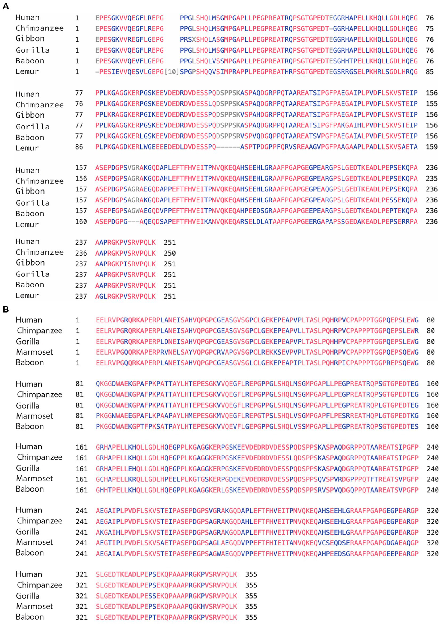 (A) Alignment of exon 4a in primates. Using the multiple alignment tool of COBALT for analysis of the 4a exon in primates including human, chimpanzee, gibbon, gorilla, baboon, and lemur. (B) Alignment of exon 4a-L in primates. Using the multiple alignment tool of COBALT for analysis of the 4a-L exon in primates including human, chimpanzee, gorilla, marmoset, and baboon.