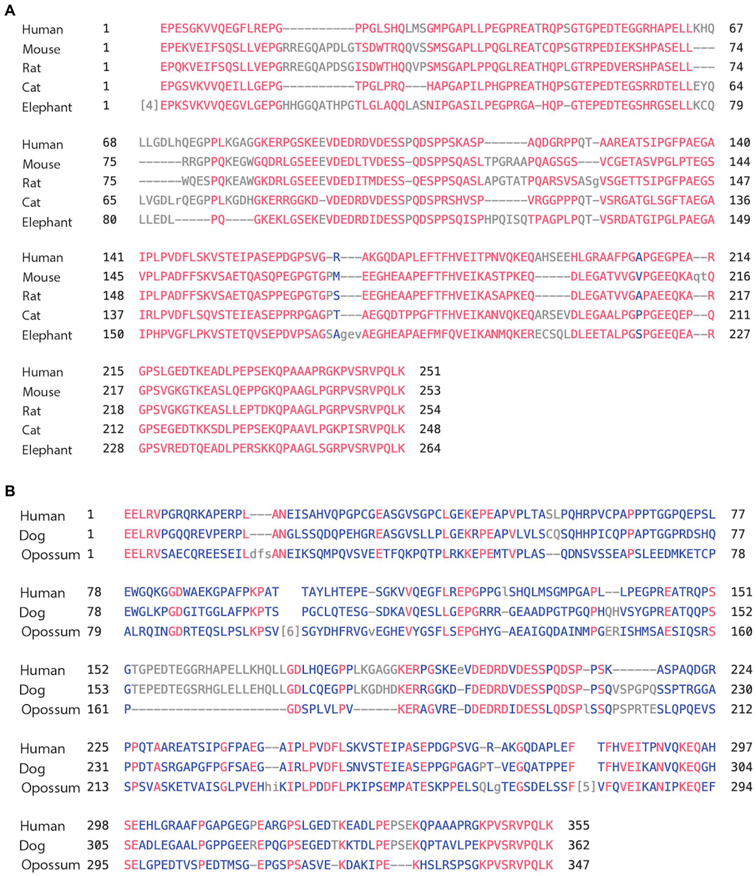 (A) Alignment of exon 4a in mammals. Using the multiple alignment tool of COBALT for analysis of the 4a exon in mammals including human, mouse, rat, cat, and elephant. (B) Alignment of exon 4a-L in mammals. Using the multiple alignment tool of COBALT for analysis of the 4a-L exon in mammals including human, dog, and opossum.