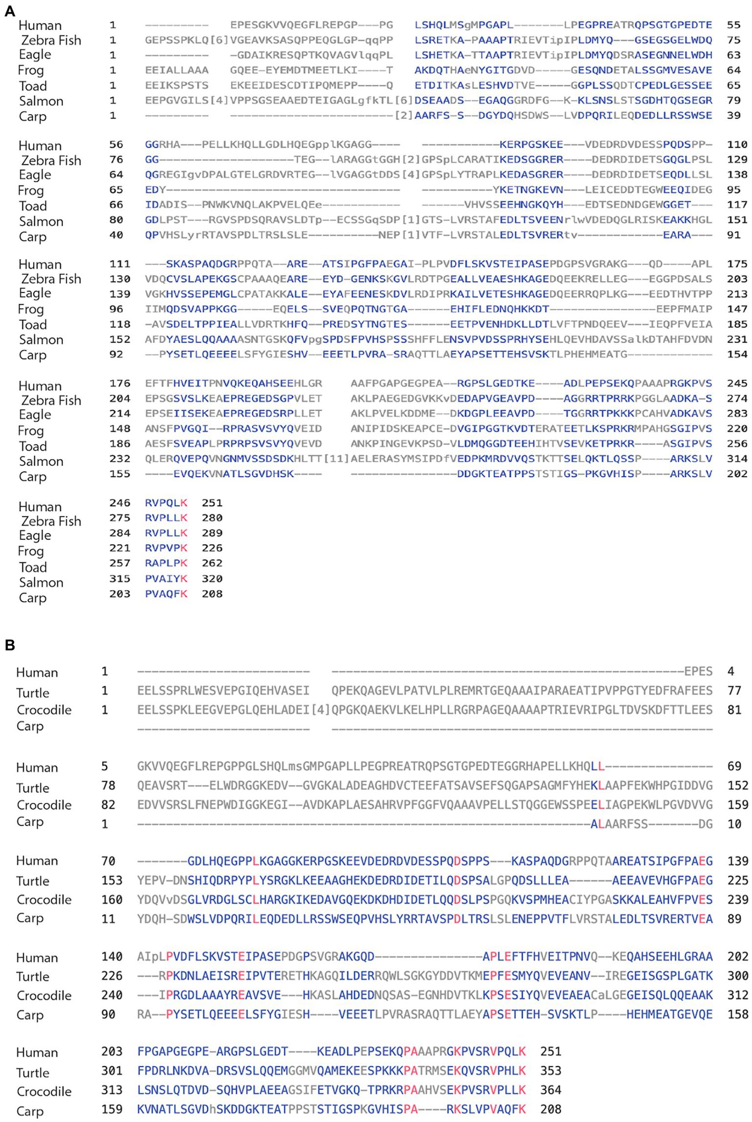 Here, we compared the human MAPT gene structures to birds: zebra finch and golden eagle, reptiles: painted turtle and Australian saltwater crocodile, amphibians: the tropical clawed Xenopus frog, the Leishan spiny toad, and fish: Atlantic salmon and Common carp (Table 3A). The overall MAPT homology against human these vertebrates decreased to 52% sequence identity with birds, 52%–50% with reptiles, 43%–41% amphibians, and 30%–27% in fish. In fact, most of the overall homology was the result of high values at the MTBD of exons 9–12 and to a lesser extent the N-terminal of exons 1–4. Indeed, the MTBD of exons 9–13 had sequence identities of 93%–81% in birds, reptiles, and amphibians, and 55%–53% in fish (Supplementary Table 3b), while exons 1–4 of the N-terminal; maintained sequence identity of 62%–60% in birds and reptiles, decreased to 38%–32% in amphibians and was no longer significant in fishes at 20%–16% (Supplementary Table 3a). These results underscore the strong conservation of the MTBD relative to the slow evolution of the N-terminal discussed later. The homology of the 4a/4a-L exons was very low in all cases ranging from 28% to 15% sequence identity (Tables 3B,C) with just a few regions of homology as shown in the alignment of Figures 4A,B. To identify the putative 4a exons, which lacked homology, we needed to identify the adjacent exons. Indeed, we calculated the average 4a conservation in these vertebrate relative to the complete MAPT to be 49%. When compared to the MTBD the relative conservation value was only 27% representing the two extremes of lowest and highest regions of homology.