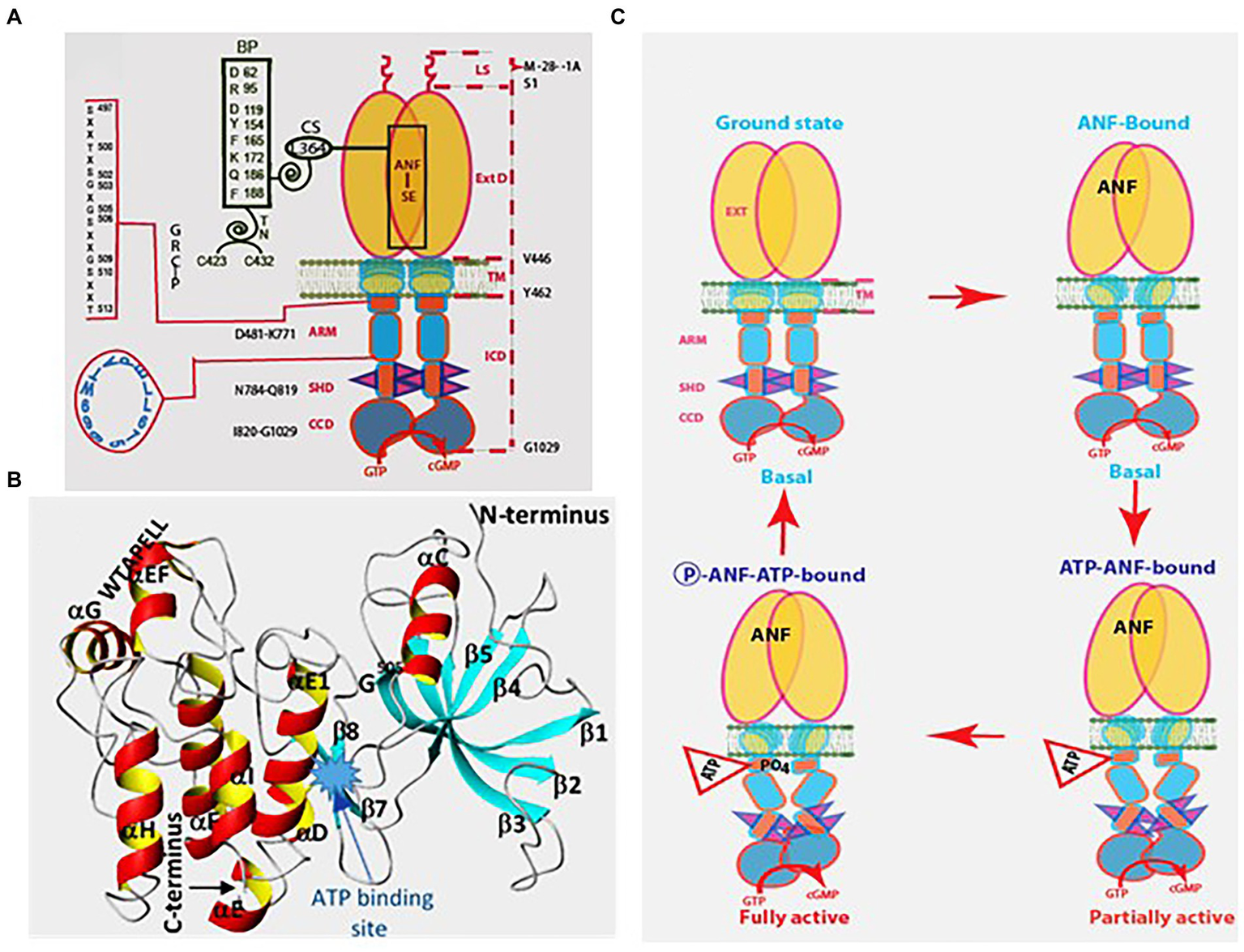 To determine the 3D-structure of the ANF-RGC ARM domain, homology-based modeling technique was used. The domain was modelled using the crystal structures of insulin receptor kinase and hematopoietic cell kinase as templates (Duda et al., 2000b; Sharma et al., 2001). Its functional determinants were deciphered and verified through point mutation/expression, time-resolved tryptophan fluorescence, Forster Resonance Energy Transfer, reconstitution and mass spectroscopic studies (reviewed in Sharma and Duda, 2014b).