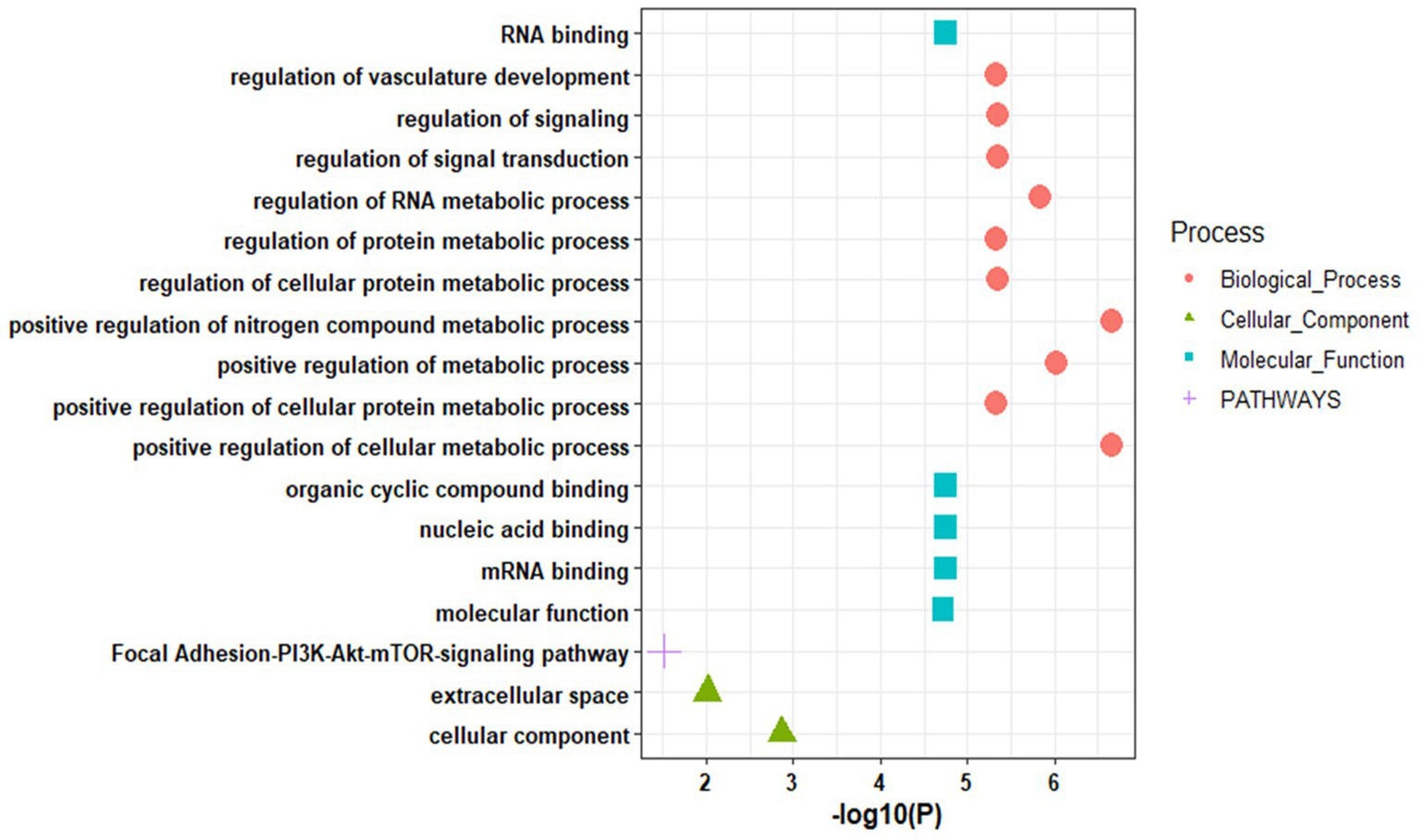 Further, the enrichment analysis of top identified miRNAs reveals their role in biological processes such as positive regulation of the cellular metabolic process, regulation of RNA metabolic process, regulation of signal transduction, regulation of signaling, regulation of vasculature development, and others. In molecular functions, the miRNAs are mainly enriched in RNA binding, mRNA binding, nucleic acid binding, and organic cyclic compound binding. These miRNAs showed enrichment in the focal adhesion-PI3K-Akt–mTOR-signaling pathway (Figure 5; Supplementary Table S6).