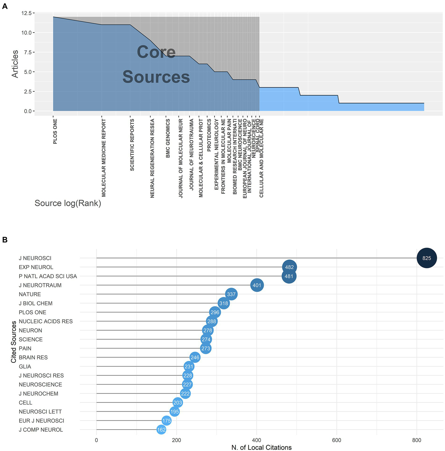Figure 5B displays the top 20 most locally cited sources. The publications in the Journal of Neuroscience (IF = 6.167) were cited by the retrieved documents 825 times, far more than other journals, which indicated that the Journal of Neuroscience was the most influential source in the field. When the top 12 highly productive journals were compared to the top 20 most cited sources, Experimental Neurology (IF = 5.330), Journal of Neurotrauma (IF = 5.269) and Plos One were relatively authoritative and popular in the field of gene expression in SCI. Using Citespace, the most cited journals in this field were also identified: Nature (IF = 69.504), Proceedings of the National Academy of Sciences of the United States of America (IF = 12.779), Journal of Neuroscience (IF = 6.167), Journal of Neurotrauma (IF = 5.269), Experimental Neurology (IF = 5.330). This pattern indicated that the research results in gene expression in SCI were of great significance (Supplementary Figure S3D).