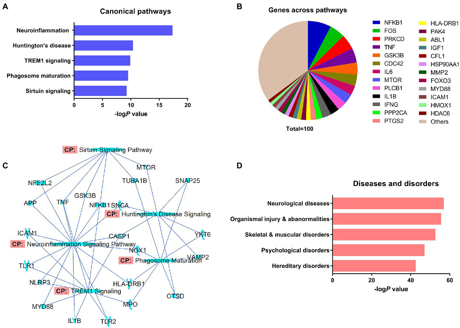 IPA predicted 426 canonical signaling pathways for α-synuclein. Neuroinflammation (P 4.78 e-18) was the most prominent of the predicted signaling pathways for α-synuclein followed by Huntington’s disease (P 4.34 e−11), triggering receptor expressed on myeloid cells 1 (TREM1; P 1.28 e−10), phagosome maturation (P 2.96 e−11), and sirtuin signaling pathways (P 5.50 e−10; Figure 2A). The major canonical signaling pathways of α-synuclein are presented in Supplementary Figures S1–S6. Next, we grouped α-synuclein and its interacting partner genes from the NCBI dataset that appeared across all the pathways together and performed a frequency distribution analysis. The analysis showed that 168 of 215 NCBI dataset genes appeared 1942 times across all the predicted canonical pathways. The analysis further revealed that nuclear factor-kappaB (NF-κB) protein subunit 1 gene (NFKB1) was the most populated gene (7.6%) across all the pathways followed by Fos proto-oncogene AP-1 transcription factor subunit (FOS; 5.1%), protein kinase C delta (PRKCD; 4.9%), tumor necrosis factor (TNF; 4.7%), glycogen synthase kinase 3 beta (GSK3B; 4.0%), cell division control protein 42 homolog (CDC42; 3.7%), interleukin 6 (IL6; 3.1%), mammalian target of rapamycin (MTOR; 3.1%), interleukin 1 beta (IL1B; 2.9%), and interferon-gamma (IFNG; 2.9%; Figure 2B; Supplementary Table S2). Thereafter, we overlapped the major canonical signaling pathways and the NCBI dataset genes expressed in those pathways, which divulged that neuroinflammation was the highest overlapped pathway with the molecules displaying a greater degree of overlapping with TREM1 and sirtuin signaling pathways. Huntington’s disease displayed a relatively higher extent of overlapping with phagosome maturation signaling molecules while exhibiting the least overlapping with TREM1 signaling molecules. Furthermore, among the overlapped molecules, the molecules associated with inflammation, namely NFKB1, TNF, and caspase-1 (CASP1) displayed the highest prevalence across the overlapped pathways (Figure 2C). In our analysis of the pathological role of α-synuclein, it was highest implicated in neurological diseases (P 2.34 e−57), followed by organismal injury and abnormalities (P 6.21 e−56), skeletal and muscular disorders (P 4.55 e−53), psychological disorders (P 1.96 e−47), and hereditary disorders (P 6.27 e−43; Figure 2D; Supplementary Figure S7).