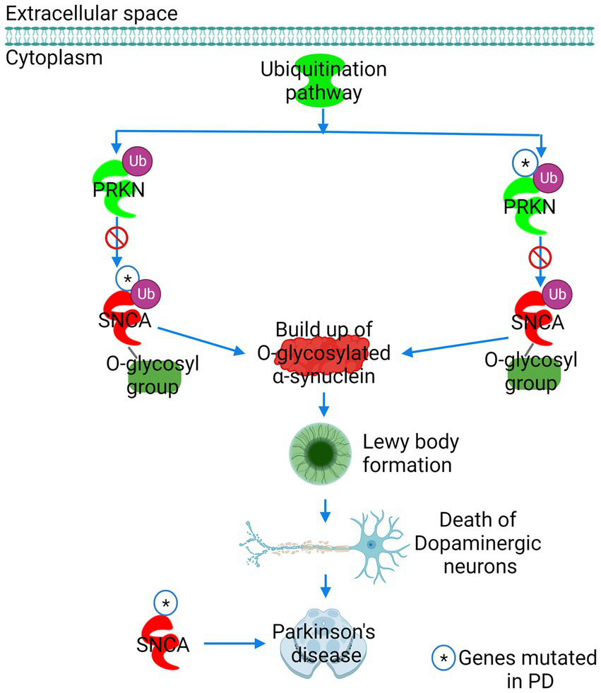 The role of α-synuclein in Parkinson’s disease (PD) predicted by IPA. PD was ranked as the leading pathway of α-synuclein toxicity. The E3 ubiquitin ligase Parkin (PRKN) labels the glycosylated form of synuclein (SNCA) for proteasomal degradation. Mutation in either PRKN or SNCA precludes PRKN from binding to SNCA, preventing the proteasomal degradation of glycosylated α-synuclein. A build-up of glycosylated α-synuclein in neuronal cells results in the formation of Lewy bodies, leading to dopaminergic neuron death and PD. Figure created with BioRender.com.