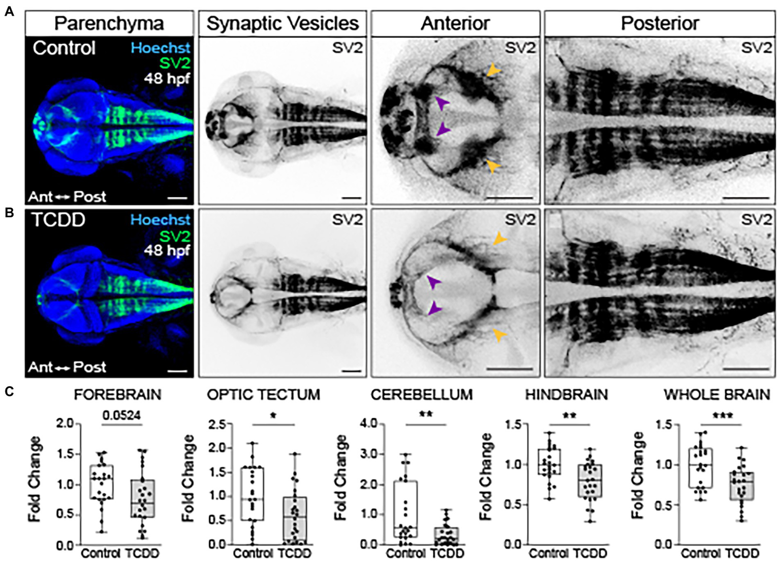 Figure 5. Embryonic TCDD exposure reduces synaptic vesicle 2 immunoreactivity. Dorsal confocal images of control (A) and TCDD-exposed (B) zebrafish at 48 hpf. The brain parenchyma was stained with Hoechst (DNA, blue) and immunolabeled with an antibody marking synaptic vesicle glycoprotein 2 (SV2) (green and inverted black). Forebrain vesicle production was decreased following TCDD exposure with notable reductions in the habenula (purple arrowheads). SV2 immunoreactivity was significantly reduced in the optic tectum (yellow arrowheads), cerebellum and hindbrain, and whole brain following TCDD exposure. (C) Fold change of SV2 immunolabeling in the forebrain, optic tectum, cerebellum, hindbrain, and whole brain was calculated relative to mean SV2 area coverage of controls. Statistical significance was determined by Welch’s t-test, *p < 0.05, **p < 0.01, ***p < 0.001. n = 23–24 fish/group across 3 replicates. Scale bar = 100 μm. Anterior (Ant) is left in all confocal micrographs.