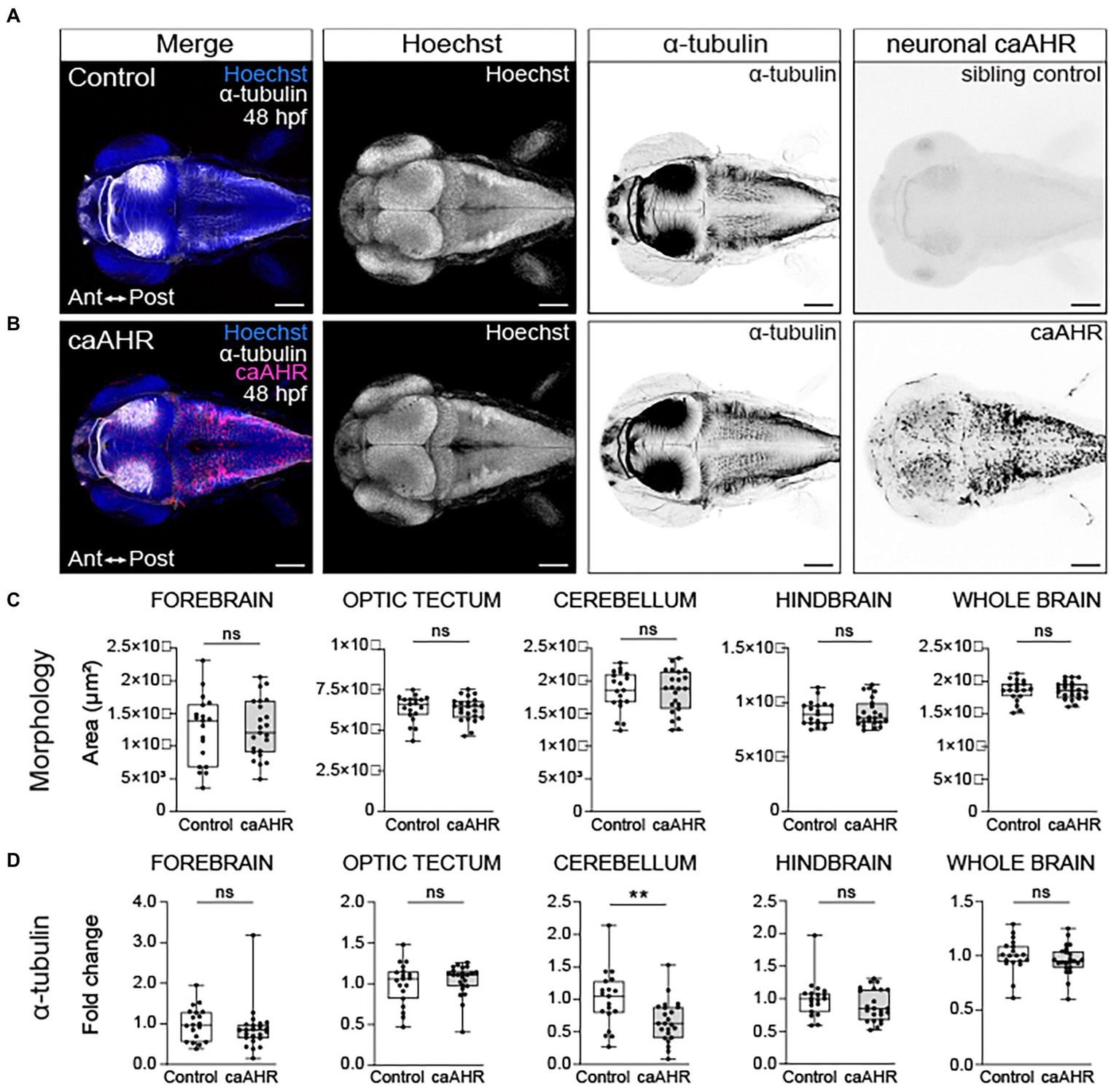 Figure 7. Neuron-specific activation of AHR disrupts the development of the cerebellum without affecting brain regions disrupted by global AHR activation. Confocal images at 48- hpf of control embryos (A) and embryos with neuron-specific expression of a constitutively active AHR [Tg(elav3l:Gal4;UAS:caAHR:2A-tRFP)] (B). Embryos were stained with Hoechst (blue in the first panel and white in second panel of both A,B) to visualize the brain parenchyma and immunolabeled with an anti-acetylated alpha tubulin antibody (α-tubulin) to mark axon tracts (white in the first panel and inverted black in the third panel of both A,B). There were no differences in the morphology of the forebrain, optic tectum, cerebellum, hindbrain, and whole brain at 48 hpf when comparing control (C) embryos to embryos with neuron-specific expression of a constitutively active AHR. (D) Fold change in acetylated α-tubulin expression in the forebrain, optic tectum, cerebellum, hindbrain, and whole brain in control and Tg(elav3l:Gal4;UAS:caAHR:2A-tRFP embryos relative to mean area coverage of α-tubulin in wild-type embryos. Statistical significance determined by Welch’s t-test, *p < 0.05, **p < 0.01, ***p < 0.001. n = 19–23 fish/group across 3 replicates. Anterior (Ant) is left in all confocal micrographs. Scale bar = 100 μm. Magnification = 10x.