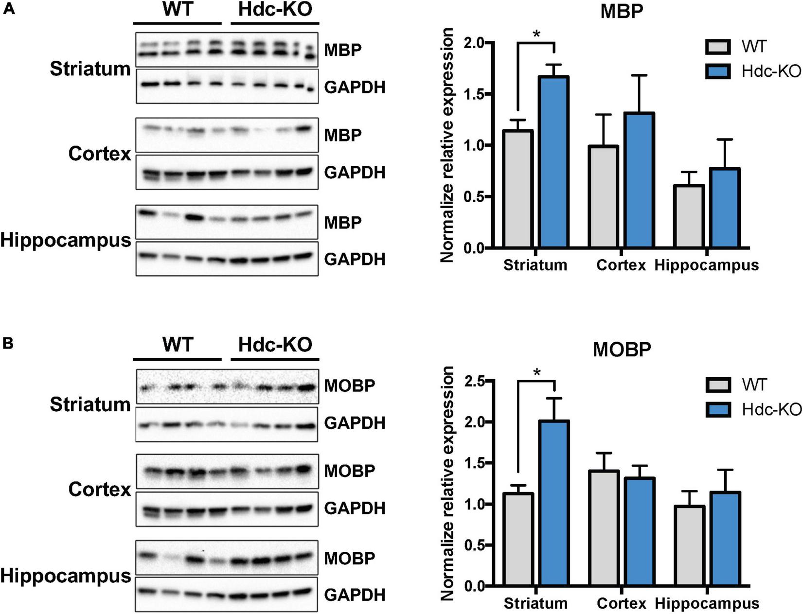 RNAseq and qPCR assess transcriptional changes, but these do not necessarily translate into alterations in protein abundance. We therefore next tested the expression of myelin proteins-related in Hdc-KO and WT mice using immunoblotting. Both MBP (Figure 2A) and MOBP (Figure 2B) were upregulated in dorsal striatum of Hdc-KO mice, but not in cortex or hippocampus. This is consistent with the findings of RNA-seq and RT-PCR for these genes.
