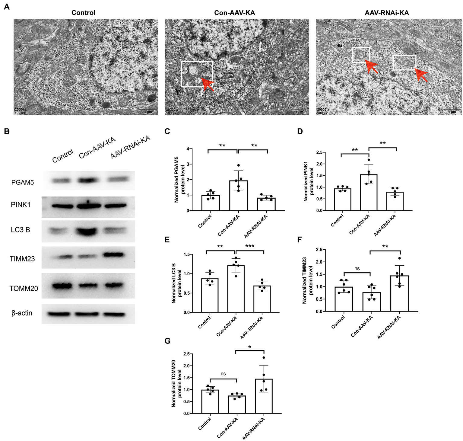 Figure 5. Knockdown of PGAM5 inhibited KA-induced mitophagy activity. (A) The representative images showed that the mitochondrial structure was normal in the Control group; mitochondria phagocytosed by double-membrane structures were labeled with red arrow and white square in the Con-AAV-KA group; no significant vacuolar degeneration and cell membrane rupture were observed in the AAV-RNAi-KA group by TEM. Scale bar: 1 μm. (B–G) Protein levels of PGAM5, PINK1, LC3 B, TIMM23, TOMM20 in the hippocampus of three groups were measured by western blot (n = 5). TEM, transmission electron microscope; PGAM5, phosphoglycerate mutase 5; PINK1, PTEN-induced putative kinase 1; LC3, light chain 3; TOMM20, translocase of the outer mitochondrial membrane 20; TIMM23, translocase of the inner mitochondrial membrane 23; IgG, immunoglobulin G. Data are expressed as Means ± SD *p < 0.05, **p < 0.01, ***p < 0.001, ****p < 0.0001.