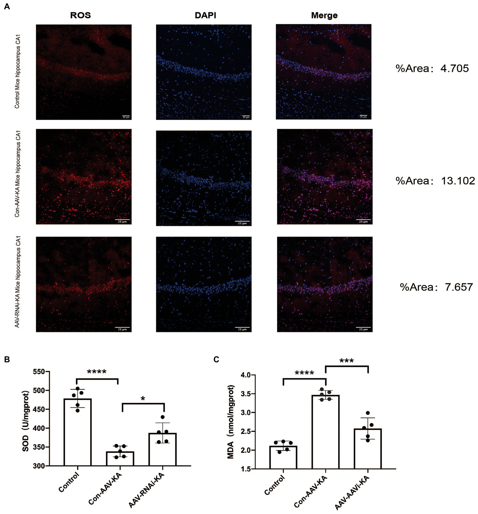The levels of MDA and SOD in hippocampal tissues were measured using the MDA and SOD assay kits (Solarbio-BC0020; BC0170), respectively, following the manufacturer’s instructions, including the use of all quality controls as well as negative controls. The Cell lysis buffer was added to each hippocampal tissue in the Control, Con-AAV-KA, and AAV-RNAi-KA groups for lysing the hippocampal tissues. (Tissue weight (mg): lysis buffer volume (μl) = 1: 9, Western and IP cell lysis buffer, Beyotime, Shanghai, China). Under ice-water bath conditions, mechanical homogenization was performed to prepare the hippocampal tissue into 10% homogenate. After homogenization, the mixture was centrifuged at 10,000 g-12,000 g for 10 min, and the supernatant was taken for subsequent MDA and SOD measurements. Briefly, after the experimental procedures were performed according to the instructions, the fluorescence (excitation at 550 nm for SOD and excitation at 532 nm for MDA was measured) with a microplate reader (Thermo Fisher) was measured with a microplate reader and values were saved for offline analysis.