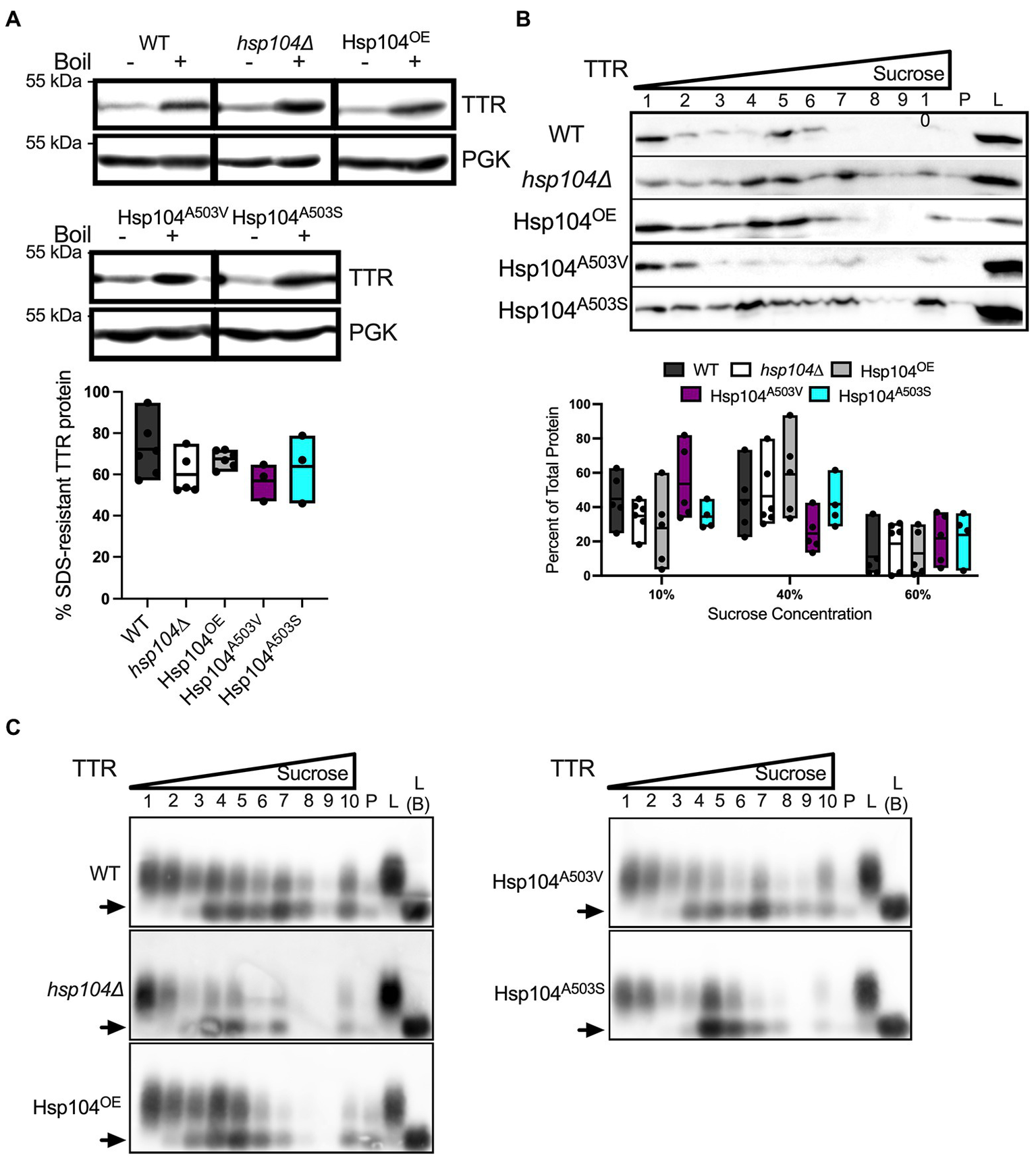 Hsp104A503S mutant maintains SDS-resistant TTR oligomer sizes but lead to larger TTR aggregates