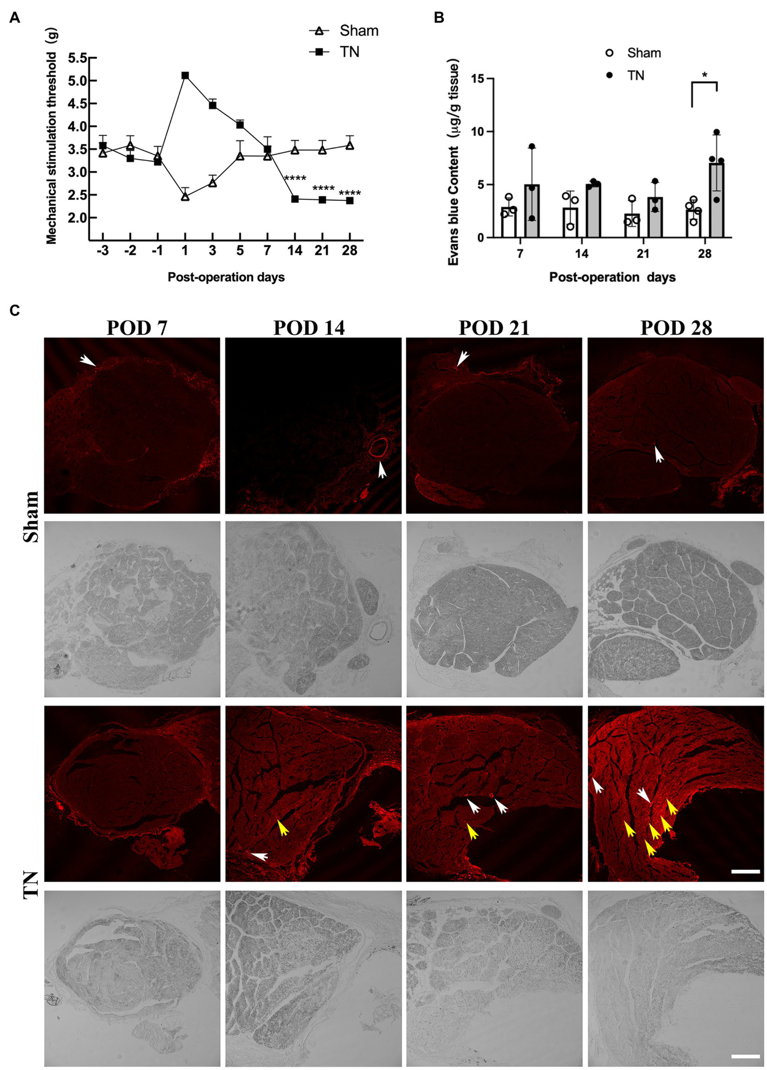 To examine whether compression injury of the TREZ induces disruption of the BNB, an Evans blue extravasation test was conducted. The results showed that the permeability of the BNB increased slightly in the TN group on PODs 7, 14, and 21 and was markedly upregulated on POD 28 compared with the sham group (Figures 2B,C). Notably, Evans blue exudation in the sham group was mainly restricted to the vascular wall and surrounding area (Figure 2C, white arrow), while endoneurial exudation was not obvious. In contrast, more Evans blue exudation was observed in the nerve bundle (Figure 2C and Supplementary Figure 1, yellow arrow) in the TN group, which indicated that the integrity of the BNB was impaired upon compression injury of the TREZ.