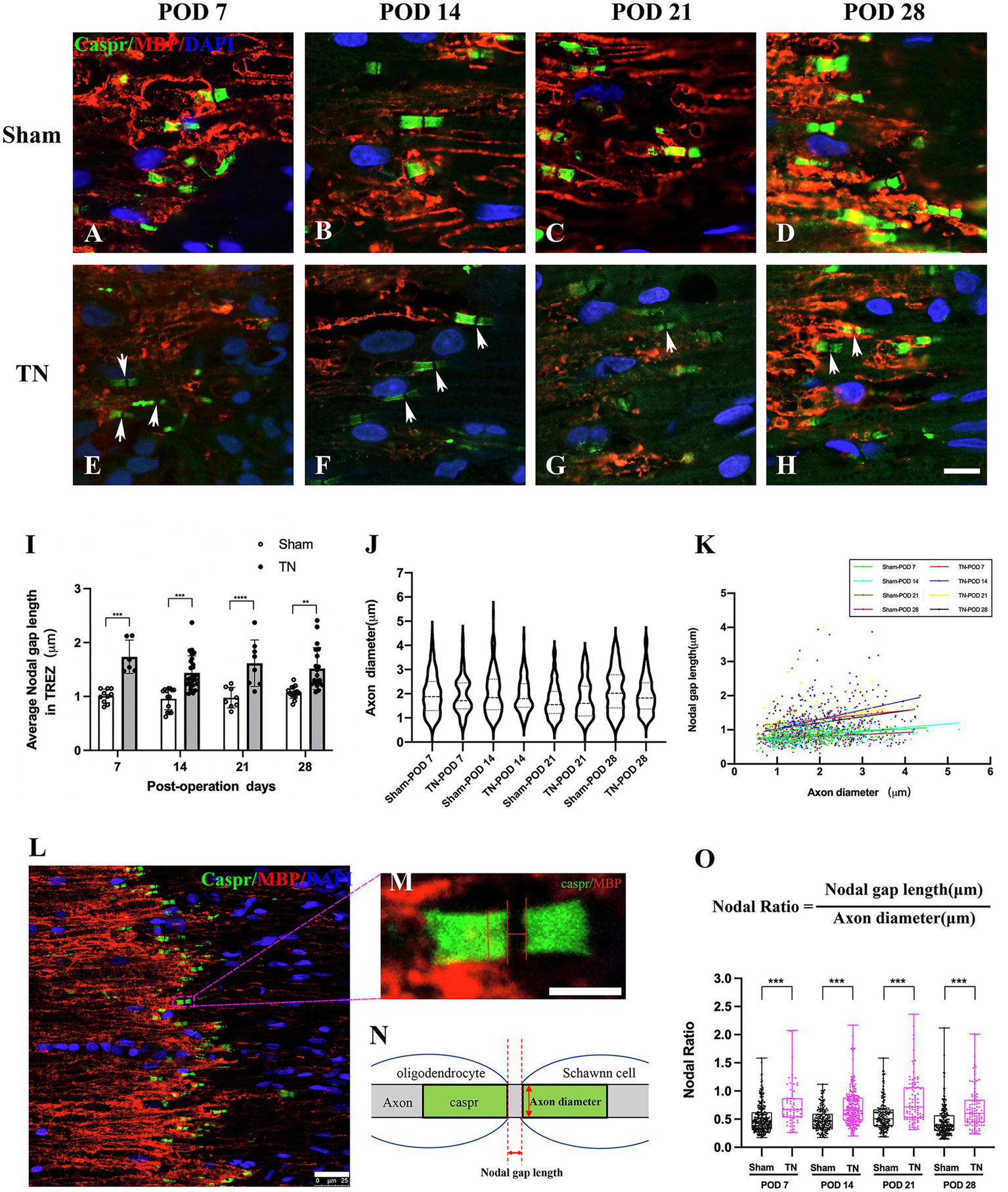 Changes in nodal gap lengths, axon diameters and nodal ratios at the CNS-PNS interface in the TREZ. (A–H) Magnified observations of the CNS-PNS interface in the TREZ. MBP (red) immunofluorescence staining is mainly distributed in oligodendrocytes on the CNS side, while a small amount can also be expressed in Schwann cells in the PNS. Caspr (green) immunofluorescence staining showed paranodal regions and nodal gaps (white arrows). Bar = 10 μm. Images were obtained using the same Leica TCS SP8 microscope settings (logical size, X = 2048 pixels, Y = 2048 pixels, Z = 1 pixel, pixel size = 0.284 μm). (I) The nodal gap lengths at the CNS-PNS interface in the TREZ in the TN group were longer than those in the sham group (p < 0.001). Data are expressed as the mean ± SD and were analyzed using two-way ANOVA followed by Sidak’s multiple comparisons test. **p < 0.01, ***p < 0.001, ****p < 0.0001. (J) No significant differences were observed in the axon diameters of myelinated nerve fibers at the CNS-PNS interface between the two groups. (K) The distribution of myelinated nerve fibers with different diameters and nodal gap lengths at the CNS-PNS interface in the TREZ. Linear correlation regression analysis showed that in the TN group, larger diameter myelinated nerve fibers had a wider nodal gap at the CNS-PNS interface. (L–N) Images of nodes of Ranvier at the CNS-PNS interface in the TREZ and theFIGURE 5 Continuedcorresponding schematic diagram. L: bar = 25 μm. M: bar = 5 μm. (O) From PODs 7 to 28, the nodal ratios in the TN group were significantly larger than those in the sham group. Box plot shows all points (Min to Max) and were analyzed using two-way ANOVA followed by Sidak’s multiple comparisons test. ***p < 0.001.