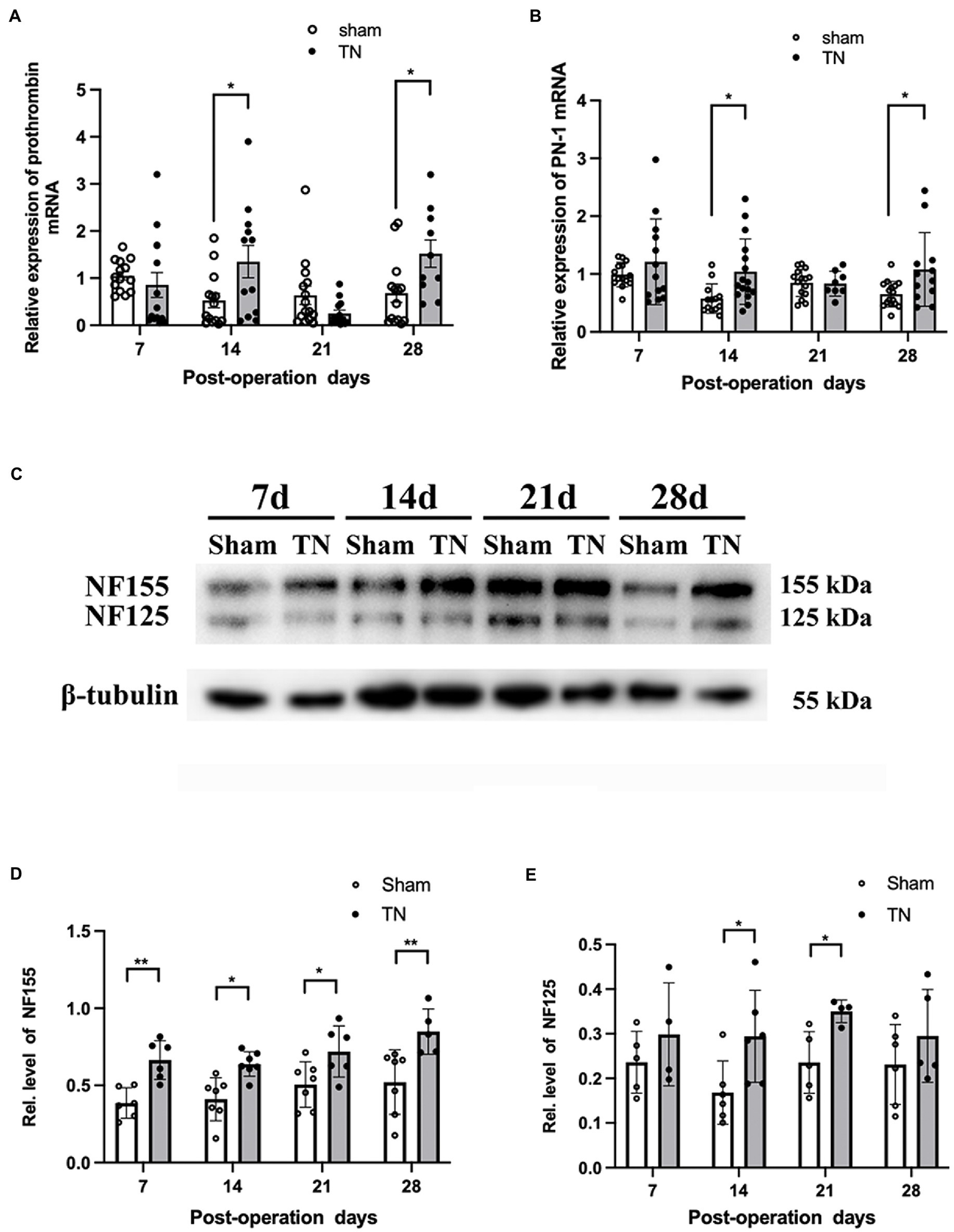 Due to the activation of the coagulation/anti-coagulation system in the TREZ, we speculated the paranodal protein NF155 in the TREZ may undergo proteolysis during TN pathogenesis, to validate the hypothesis; a Western blotting assay was performed. As shown by Western blotting, two bands of NF155 protein (155 and 125 kDa) were detected (Figure 6C), which suggests that some NF155 proteins may have been hydrolyzed into NF125 and NF30. The expression of NF155 protein in the TN group was upregulated compared with that in the sham group (Figure 6D). Additionally, the protein expression of NF125 in the TREZ in the TN group was increased on PODs 14 and 21, but the difference between the two groups on POD 28 was not significant (Figure 6E).