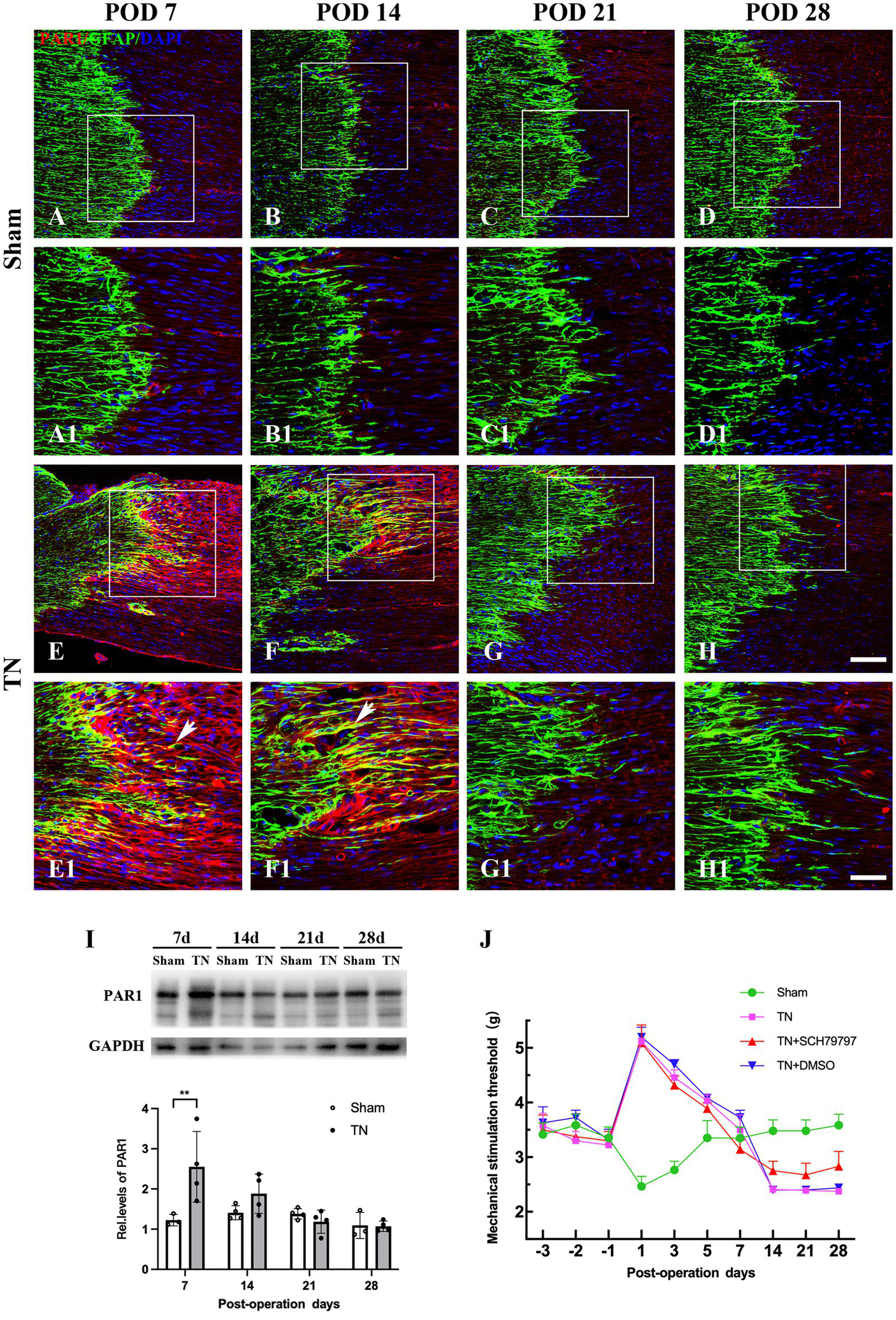 To define the spatiotemporal expression pattern of PAR1 in the TREZ of the TN rats, an immunohistochemistry assay was performed. Immunofluorescence staining showed that PAR1 was expressed on both sides of the TREZ transitional zone and was accompanied by GFAP-immunopositive astrocytes that extended from the central to the peripheral side of the TREZ (Figures 7A-H). Subsequent immunoblotting assays revealed that PAR1 protein expression in the TREZ in the TN group was significantly higher than that in the sham group on POD 7 and then gradually decreased to a level similar to that of the sham group (Figure 7I).