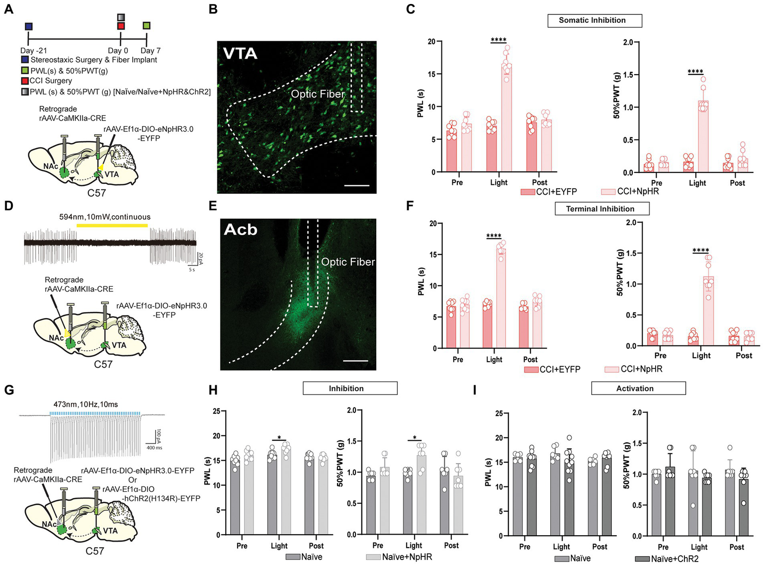 Inhibition of the glutamatergic neurons projected from VTA to NAc has relieved neuropathic pain in wild-type mice. (A) Experimental timeline. Schematic illustration depicting viral constructs. For the somatic stimulation, a retrograde CaMKIIa-CRE viral vector was injected in the NAc brain region and DIO-NpHR-EYFP injection with fiber implantation was performed on the VTA, wild-type mice were given 21 days for the expression of the virus before the CCI surgery, PWLs and 50% PWTs of the hind paws were assessed on day 7 after CCI surgery in wild-type mice. (B) Representative confocal image for somatic virus expression in VTA of wild-type mice infected by the viral vector of CaMKIIa-CRE and DIO-NpHR-EYFP for labeling glutamatergic projections. Scale bar = 200 μm. (C) The quantitative comparison of PWLs and 50% PWTs between the two groups (with and without light stimulation). Statistics show that PWLs of CCI + NpHR group exhibited a significant increase in withdrawal latency during the somatic light stimulation period [Light phase] compared with the CCI + EYFP group (n = 8, 8 mice; ****p < 0.0001), also 50% PWTs of CCI + NpHR group were also significantly increased during the somatic light stimulation [Light phase] compared with the CCI + EYFP group (n = 8, 8 mice; ***p < 0.001) of the wild-type mice. (D) 594 nm yellow laser stimulation-induced inhibition of firing activity in VTA glutamatergic neuron expressing NpHR with axonal projections to NAc (10 mW, continuous stimulation). For the terminal light stimulation, a retrograde CaMKIIa-CRE viral vector injection with fiber implantation was performed in the NAc brain region, and DIO-NpHR-EYFP was injected into the VTA, wild-type mice were given 21 days for the expression of the virus before the CCI surgery, PWLs and 50% PWTs were assessed on day 7 after CCI surgery. (E) Confocal images showing virus expression NAc axon terminals in the brain region of wild-type mice infected by the viral vector of CaMKIIa-CRE and DIO-NpHR-EYFP for labeling glutamatergic projections. Scale bar = 200 μm. (F) The quantitative comparison of PWLs and 50% PWTs between the two groups (with and without light stimulation). Statistics showing that CCI + NpHR group exhibited a significant increase in PWLs during the terminal light stimulation [Light phase] compared with the CCI + EYFP group (n = 8, 8 mice; ****p < 0.0001), 50% PWTs of CCI + NpHR group were also increased during the terminal light stimulation [Light phase] compared with the CCI + EYFP group (n = 8, 8 mice; ***p < 0.0001) in wild-type mice. (G) For the somatic activation of this pathway, a retrograde viral vector CaMKIIa-CRE viral vector were injected in the NAc brain region and DIO-ChR2-EYFP or DIO-NpHR-EYFP was injected in the VTA of naïve mice, 473 nm blue laser stimulation-induced excitation of firing activity in VTA glutamatergic neuron expressing ChR2 with axonal projections to NAc brain region (473 nm, 10 Hz, 10 ms; the validation of EYFP-NpHR viral was described previously for the somatic inhibition) and wild-type mice were given 21 days for the expression of the virus. (H) The comparison of PWLs and 50% PWTs between the two groups (with and without light stimulation). Statistics showing that Naïve + NpHR group exhibited a less significant increase in PWLs during the somatic light stimulation [Light phase] compared with the naïve group (n = 7, 7 mice; *p < 0.05), 50% PWTs of the Naïve + NpHR group also exhibited a less significant increase by the somatic light stimulation [Light phase] compared with the naïve group (n = 7, 7 mice; *p < 0.05). (I) During the terminal activation, the quantitative comparison (with and without light stimulation) of PWLs and 50% PWTs between the two groups showed Naïve + NpHR group exhibited no significant difference in PWLs by the somatic stimulation compared with the naïve group (n = 7, 7 mice; p > 0.05), 50% PWTs of the Naïve+ChR2 group also exhibited no significance with the naïve group (n = 7, 7 mice; p > 0.05) of the wild-type mice (All the readings were measured during 3 consecutive periods, and all the comparisons were performed by the two-way ANOVA test followed by Bonferroni post-test).