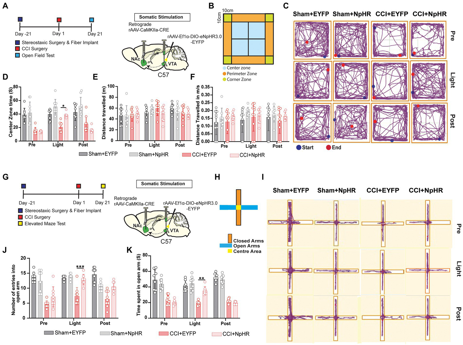Inhibition of glutamatergic neurons projected from VTA to NAc decreases anxiety and improves the exploratory behavior of mice. (A) Experimental timeline. Schematic illustration depicting viral constructs. For the somatic stimulation, a retrograde viral vector CaMKIIa-CRE viral vector was injected in the NAc brain region and DIO-NpHR-EYFP was injected in the VTA, and the optical fibers were also planted at the VTA, mice were given 21 days for the expression of the virus before the CCI or sham surgery. OFT was performed on day 21 after CCI surgery was established by the ligation of sciatic nerve and sham was produced with only an incision but without the ligation of sciatic nerve in wild-type mice. (B) Illustrated design of the field area for the OFT behavioral tests. (C) Tracing image of Sham + EYFP, Sham + NpHR, CCI + EYFP, and CCI + NpHR groups defining the roaming field of mice in different time periods. (D) The quantitative comparison regarding the time spent in the center zone by the groups of Sham + EYFP, Sham + NpHR, CCI + EYFP and CCI + NpHR (with and without light stimulation). Statistics showing that there is a significant difference regarding time duration spent in the center zone of CCI + NpHR group compared with the CCI + EYFP group (n = 8, 8, 8, 8 mice; *p < 0.05) but no significant difference compared to Sham + EYFP and Sham + NpHR (n = 8, 8, 8, 8 mice; p > 0.05) during the light stimulation period [Light phase]. (E) The quantitative comparison regarding distance traveled by the groups of Sham + EYFP, Sham +N pHR, CCI + EYFP, and CCI + NpHR. Statistics showing that all the groups showed no statistical difference in any time period. (n = 8, 8, 8, 8 mice; p > 0.05). (F) The quantitative comparison regarding speeds of Sham + EYFP, Sham + NpHR, CCI + EYFP, and CCI + NpHR. Statistics showing that all the groups showed no statistical difference in any time period. (n = 8, 8, 8, 8 mice; p > 0.05). (G) Experimental timeline. Schematic illustration depicting viral constructs. For the somatic stimulation a retrograde viral vector CaMKIIa-CRE viral vector was injected in the NAc brain region and DIO-NpHR-EYFP was injected in the VTA, the optical fiber was also implanted at the VTA, mice were given 21 days for the expression of the virus before the CCI or sham surgery. EMT was performed on day 21 after CCI surgery in wild-type mice. The ligation of sciatic nerve established the CCI pain model. Sham was produced with only an incision but without sciatic nerve ligation. (H) Illustrated design regarding the arms of elevated maze. (I) Tracing image of Sham + EYFP, Sham + NpHR, CCI + EYFP, and CCI + NpHR groups defining the roaming field of mice in different time periods. (J) The quantitative comparison regarding the number of entries in the open arms of elevated maze by the mice of the groups of Sham + EYFP, Sham + NpHR, CCI + EYFP, and CCI + NpHR (with and without light stimulation). Statistics show that CCI + EYFP group exhibited a significant decrease in the number of entries in open area compared with CCI + NpHR group (n = 8, 8, 8, 8 mice; ***p < 0.001), but CCI + NpHR had no significant difference compared to Sham + EYFP, Sham + NpHR during the somatic light stimulation [Light phase] (n = 8, 8, 8, 8 mice; p > 0.05). (K) Statistics showing that CCI + EYFP group exhibited a significant decrease in the time spent in open area compared with CCI + NpHR group (n = 8, 8, 8, 8 mice; **p < 0.01), but CCI + NpHR had no significant difference compared to Sham + EYFP, and Sham + NpHR during the somatic light stimulation [Light phase] (n = 8, 8, 8, 8 mice; p > 0.05; all comparisons were done by two-way ANOVA test followed by Bonferroni post-tests).